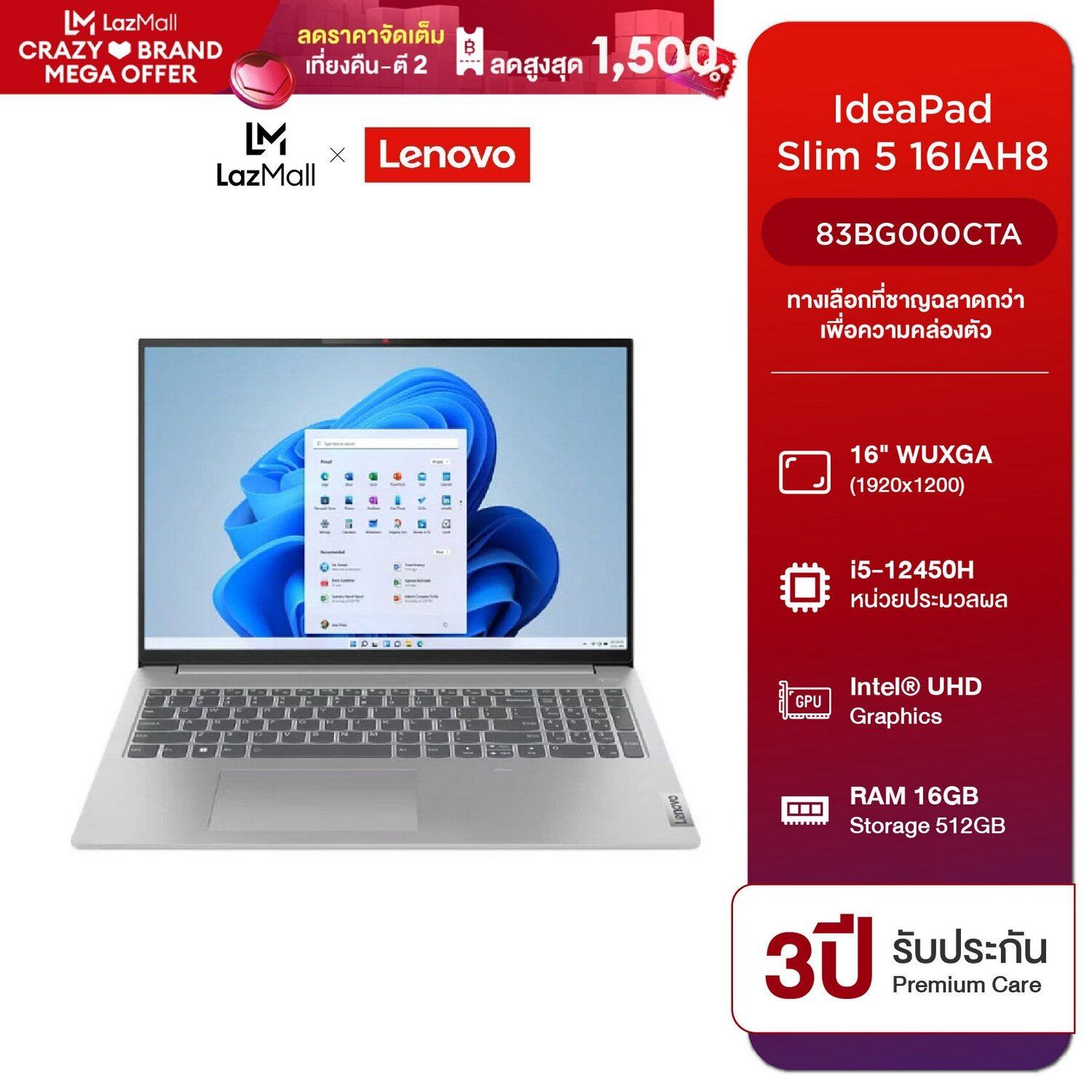[ผ่อน 0% 10 เดือน] Notebook Lenovo IdeaPad Slim 5 16IAH8-83BG000CTA [16″ WUXGA IPS /i5-12450H / RAM 16 GB DD5-4800/ SSD 512GB/Intel UHD/ Win 11 Home/ ประกัน 3 ปี Premium Care] โน้ตบุ๊ค