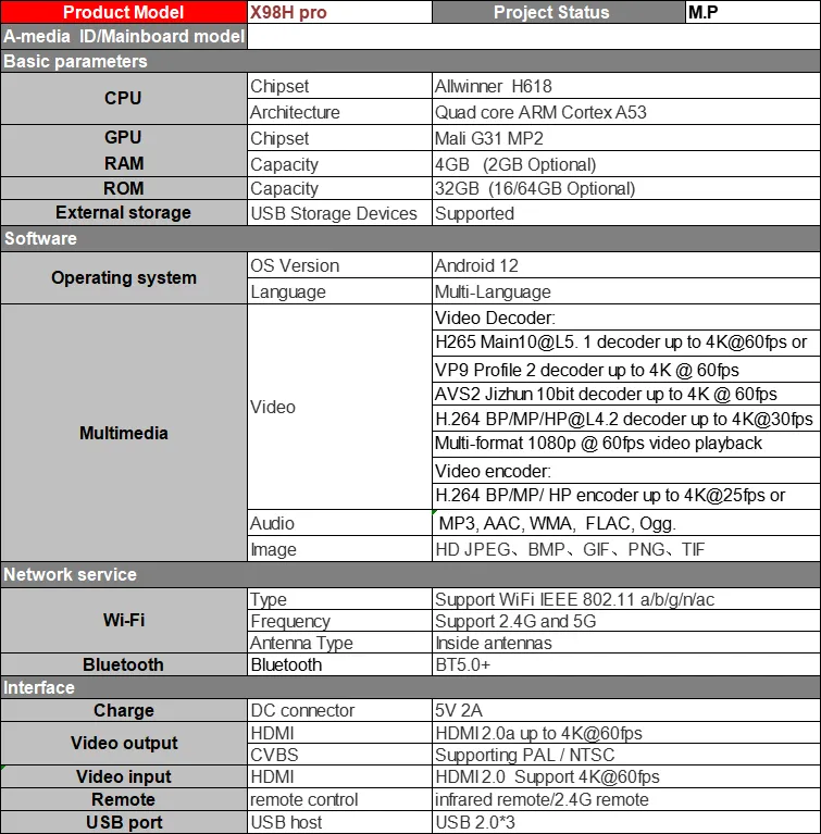 1, CPU: Allwinner H618 Quad Core ARM Cortex A53; 2, GPU: Mali-G31 MP2; 3, OS: Android 12.0; 4, หน่วยความจำ: 4GB, แฟลช32GB