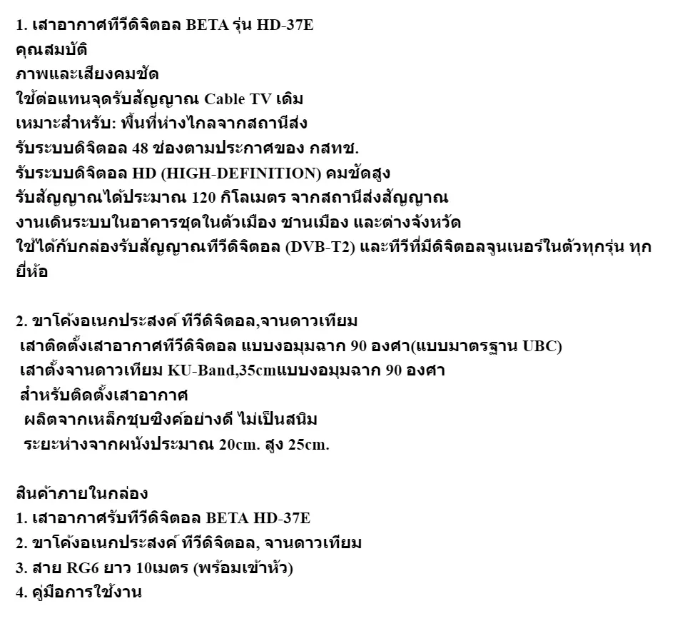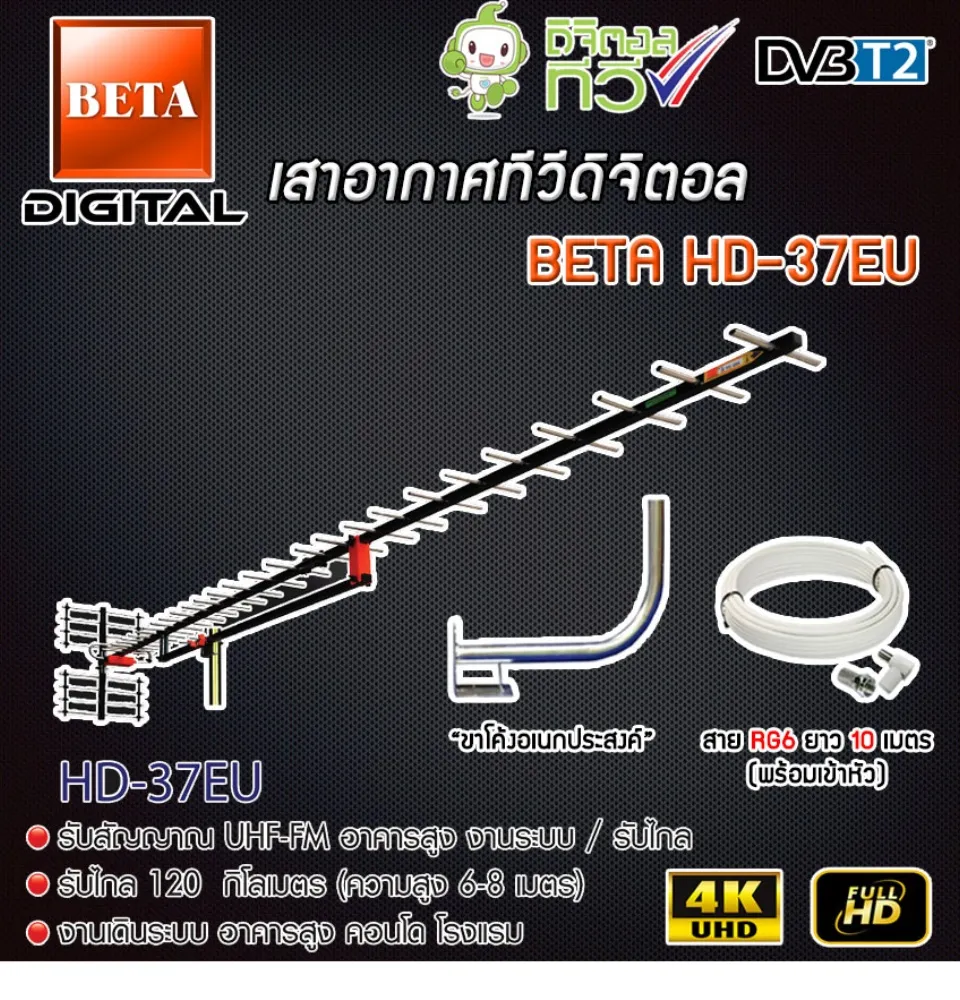 - เสาอากาศทีวีดิจิตอล BETA Digital TV Antenna HD-37E พร้อม ขาโค้งอเนกประสงค์ แถมสาย 10 เมตร