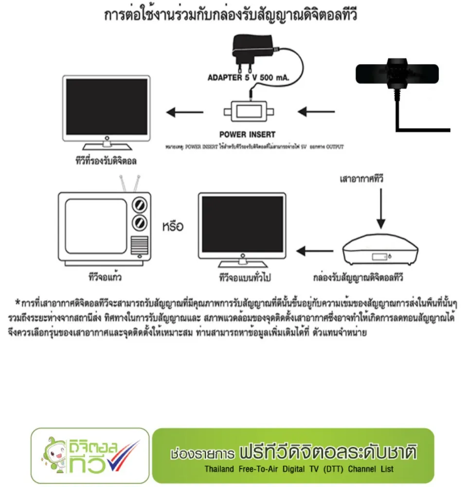 ใช้ได้กับกล่องรับสัญญาณทีวีดิจิตอล (DVB-T2) และทีวีที่มีดิจิตอลจูนเนอร์ในตัวทุกรุ่น ทุกยี่ห้อ