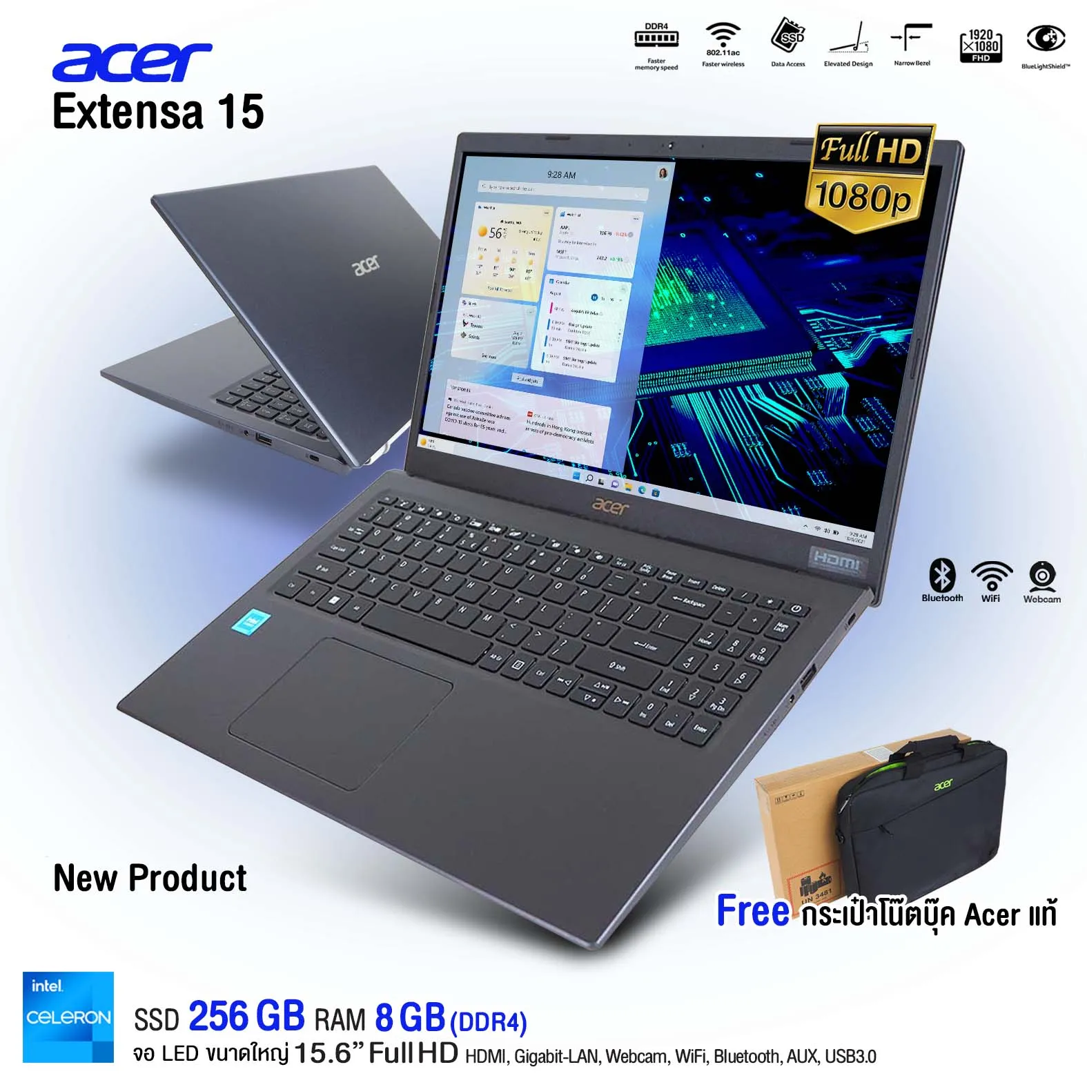 - Display : จอขนาด 15.6”1920×1080 (FullHD), 60Hz, high-brightness, Acer ComfyView, LED backlit, TFT LCD Main