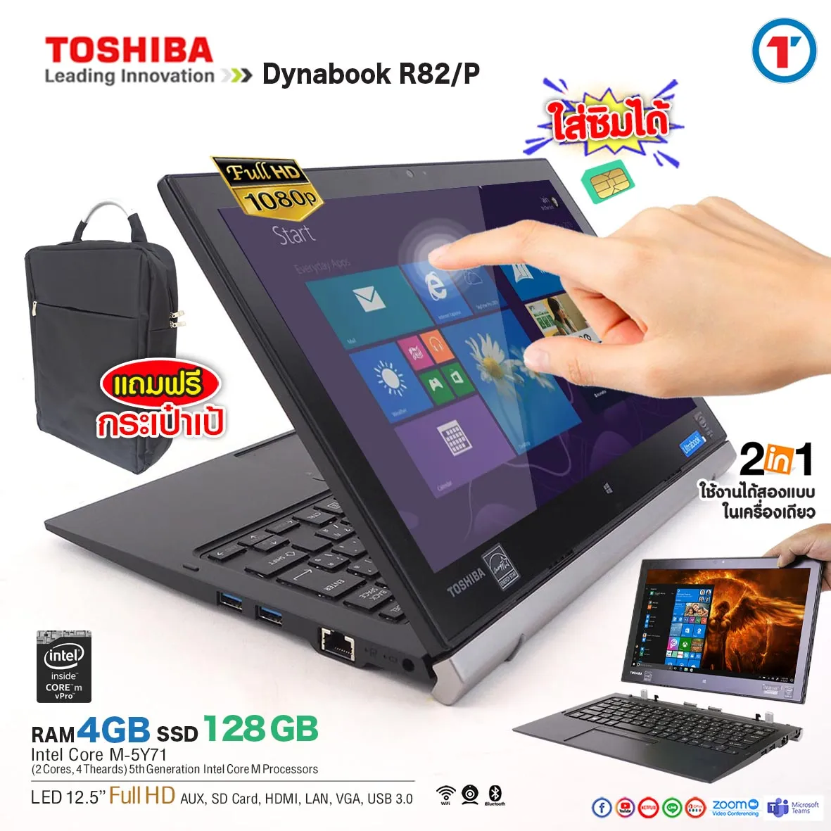 Toshiba R82/P 2 in 1 จอใหญ่เต็มตาแบบ HD มากับ Core M5Y71 RAM 4 SSD 128 GB แรงเร็วลื่นไหลไม่สะดุด สูงสุดที่ 2.9 GHz ทำงานได้สะดวก ทำงานเอกสาร WFH ได้ สบายๆ ใส่ซิมส์ได้ มีกล้องหน้า-หลังในตัว จะใช้เป็นแท็บเลตหรือโน๊ตบุ๊คก็ได้สบายๆ พอร์ตเชื่อมต่อครบครัน สามารถลงโปรแกรมพื้นฐานพร้อมใช้งานเช่น Microsoft Office, Photoshop, Illustrator, Line, Karaoke (on request) และ เกมส์ 200 เกมส์ ไม่ต้องต่อเน็ต