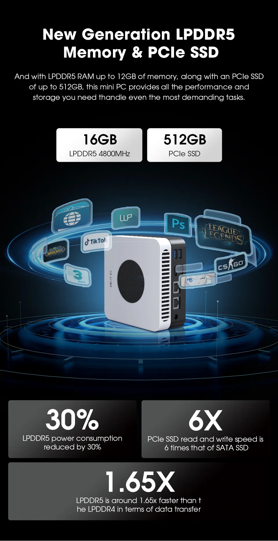 - มินิโฮสต์ตัวเครื่องโดยใช้ตัวประมวลผล N100 alderlake-N การออกแบบพลังงานความร้อน15wtdp ประสิทธิภาพสูงถึง Intel7th i5หลักการ์ดจอในการเล่นเกมออนไลน์หน่วยความจำ LPDDR5 12GB SSD ความเร็วสูง512GB, พอร์ตเครือข่าย RJ45คู่ (1G * 1/2.5g * 1) ทำงานได้อย่างสมบูรณ์