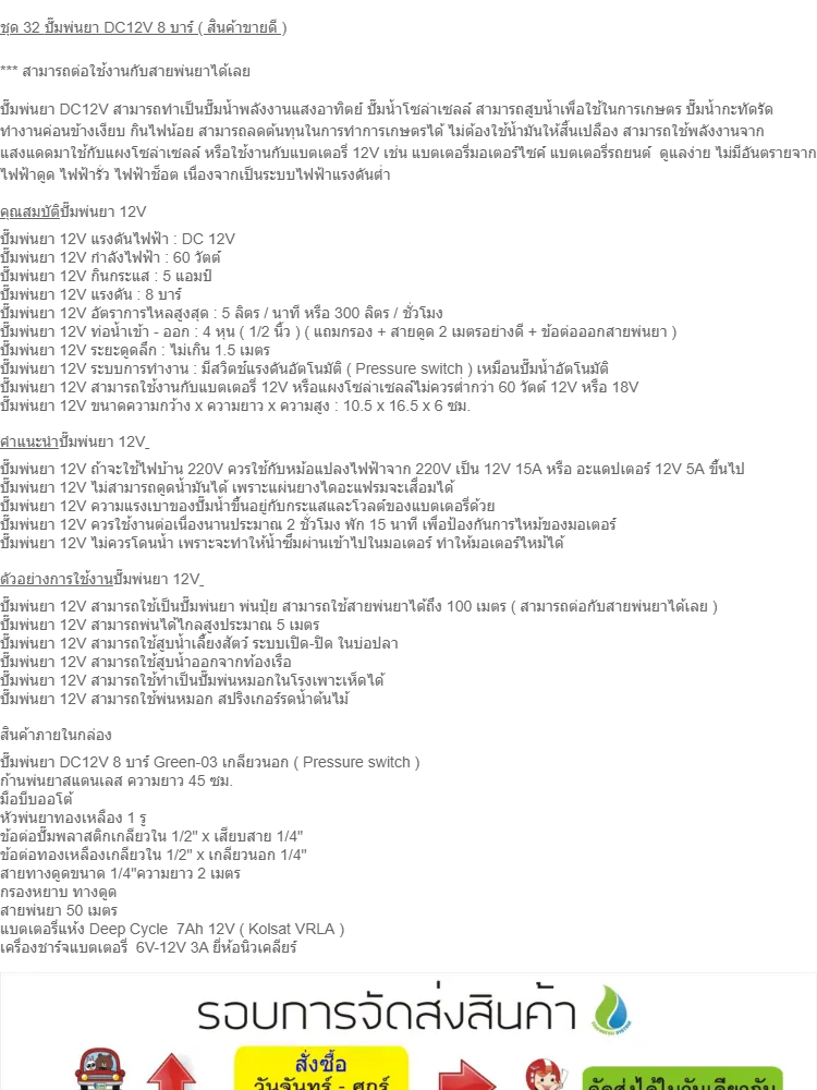 F1012 ชุด 32 ปั๊มพ่นยา DC12V 8 บาร์ ( สินค้าขายดี ) + สายพ่นยา 50 เมตร