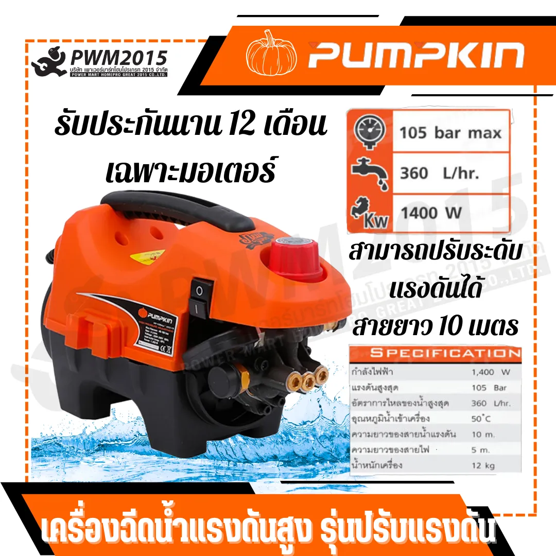 F1060 PUMPKIN เครื่องฉีดน้ำแรงดันสูง รุ่นปรับแรงดัน NEW YORK PLUS 105 bar สายฉีดน้ำแรงดันสูง ล้างพื้น ล้างแอร์ J2P