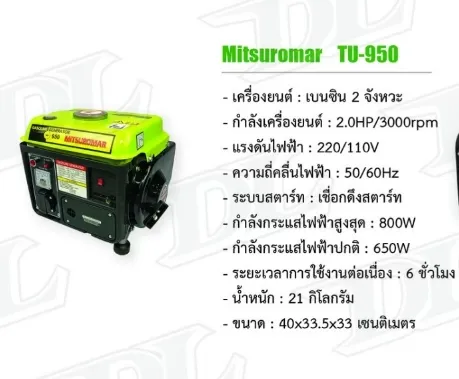 เครื่องปั่นไฟ ให้กำลังไฟสูงสุด 800W ระยะเวลาใช้งานต่อเนื่อง 6 ชั่วโมง เครื่อง 2 จังหวะ ใช้พัดลม หลอดไฟ และ ไฟฟ้าได้ไม่เกิน 800W