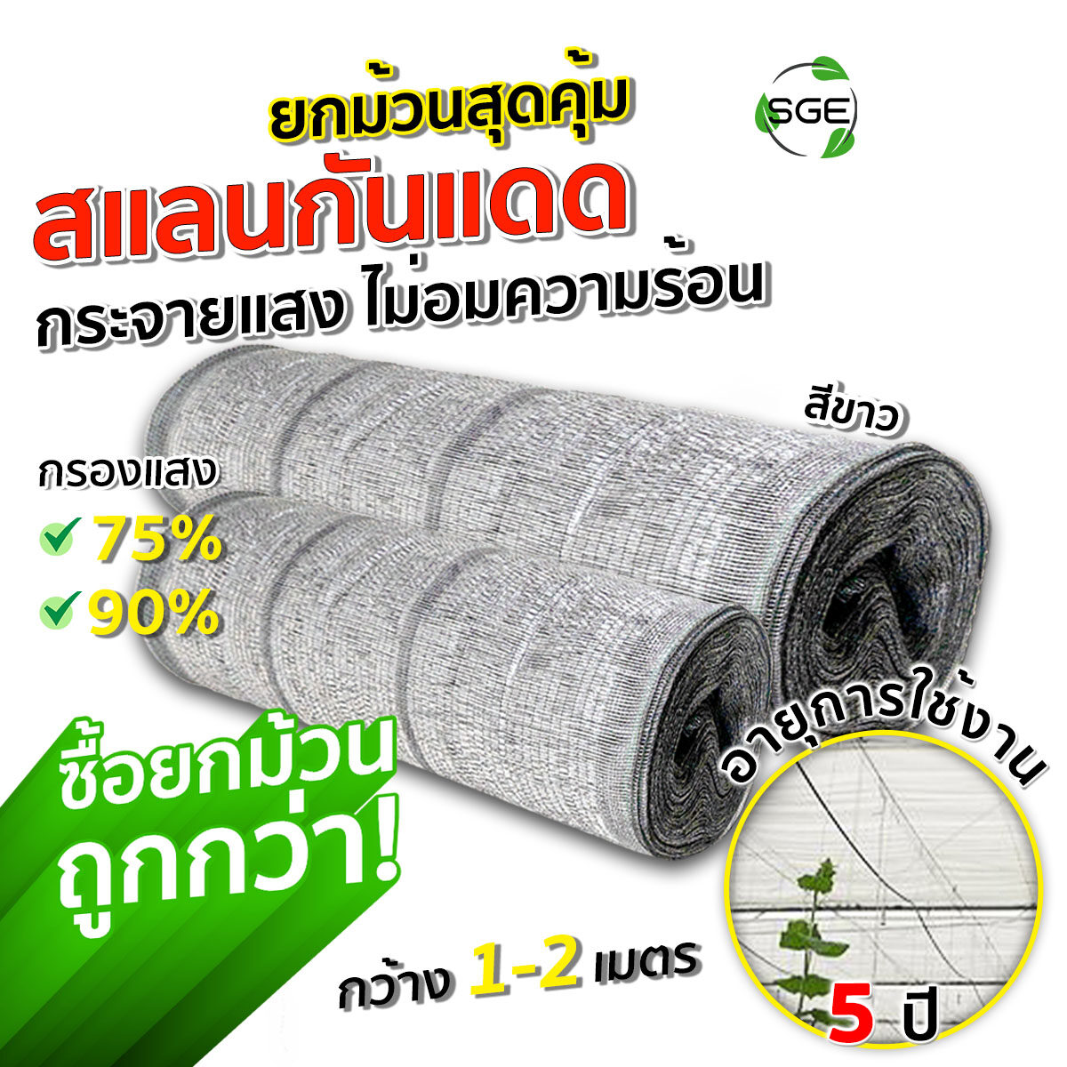F1084 สแลน สแลนกันแดด รุ่น SN สีขาว ตาข่ายกรองแสง เหนียว ทนทาน คุณภาพสูงเกรด Premium ใช้งานได้นาน ยกม้วน!!! ของแท้จาก SGE!!!