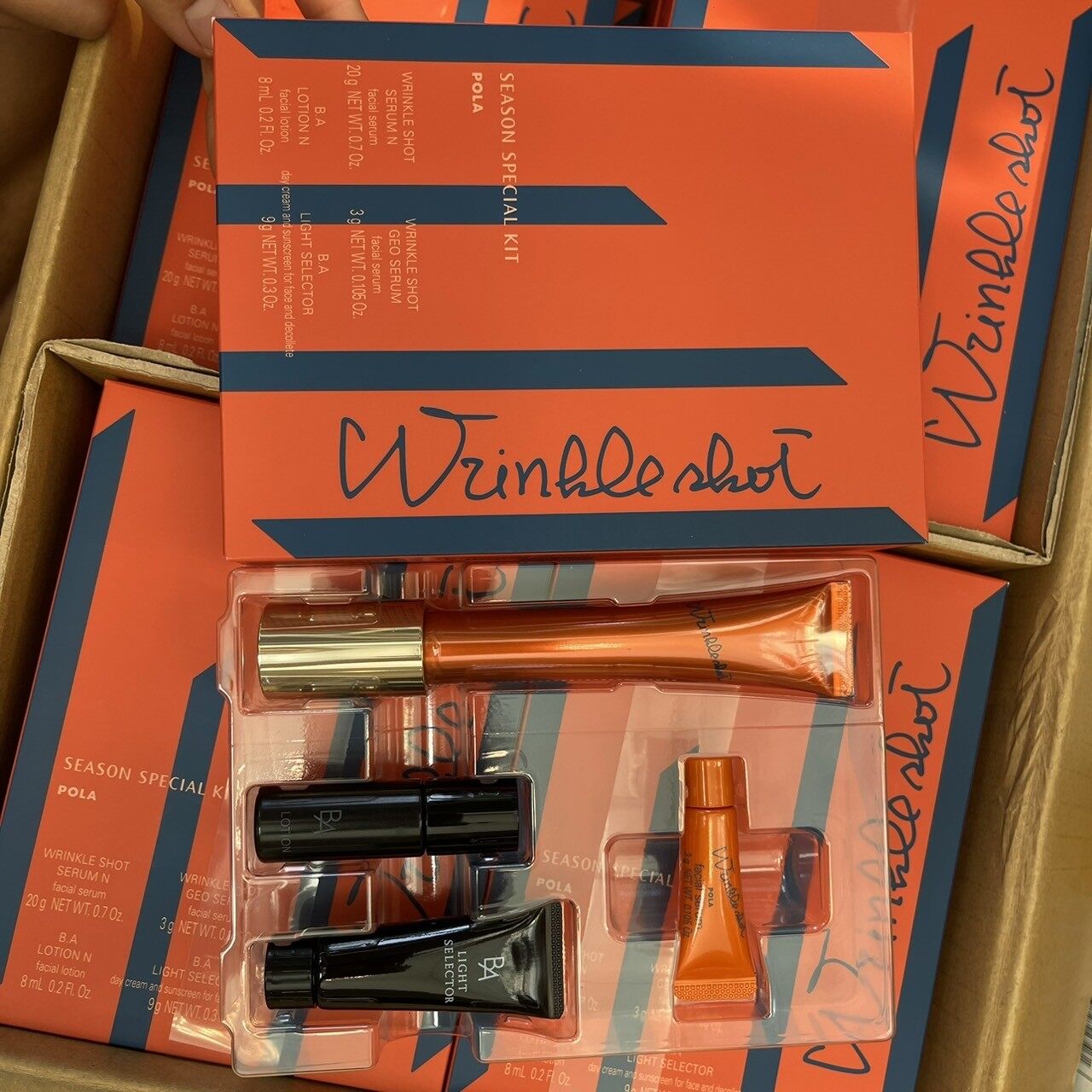 - ภายในชุดประกอบด้วยเป็นเซ็ตล่าสุดที่วางขายในห้างค่ะ■ Wrinkle Shot Serum 20g■ GEO SERUM8g■ B.A Lotion 8ml■ B.A Milk 8ml เซรั่มลดเลือนริ้วรอยชิ้นโปรด ที่ขายมาแล้ว 1,200,000 หลอดภายในปีเดียวที่ประเทศญี่ปุ่น และกวาดรางวัลมากว่า 40 รางวัล POLA WRINKLE SHOT SERUM ที่พัฒนามาเป็นเวลานานกว่า 15 ปี จากส่วนผสมต่างๆ ประมาณ 5,400 ชนิด และผ่านการรับรองมาตรฐานจากทางรัฐบาลของญี่ปุ่นโดยใช้เวลากว่า 8 ปี ในฐานะ Quasi Drug (ผลิตภัณฑ์กึ่งยา) สำหรับลดเลือนริ้วรอยเป็นเจ้าแรก