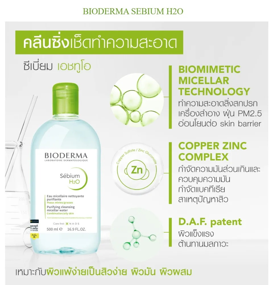 - Sebium H2O คลีนซิ่งและเมคอัพรีมูฟเวอร์ ทำความสะอาดสิ่งสกปรกและเครื่องสำอางได้อย่างหมดจด เหมาะสำหรับผู้มีผิวมันเป็นสิวง่าย มีคอปเปอร์ซัลเฟตช่วยลดเชื้อแบคทีเรีย และซิงค์ลดความมันบนผิว ปราศจากแอลกอฮอล์และสารแต่งสี