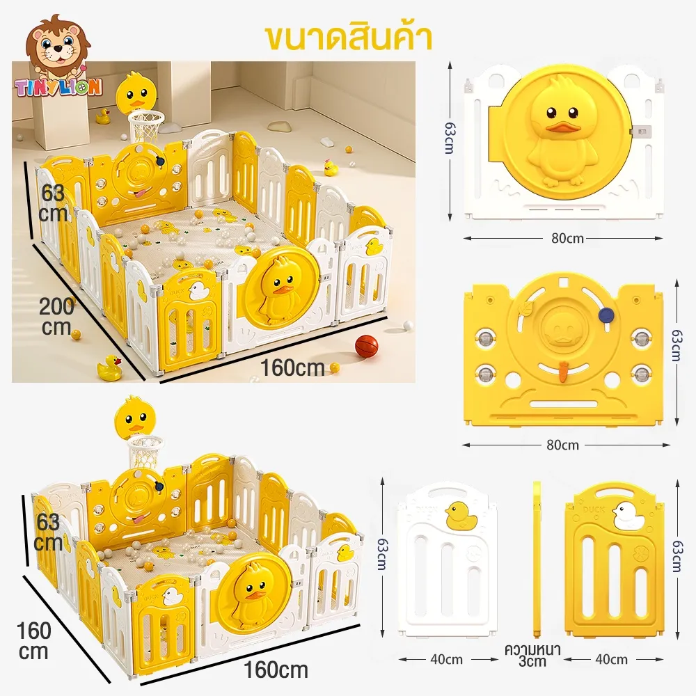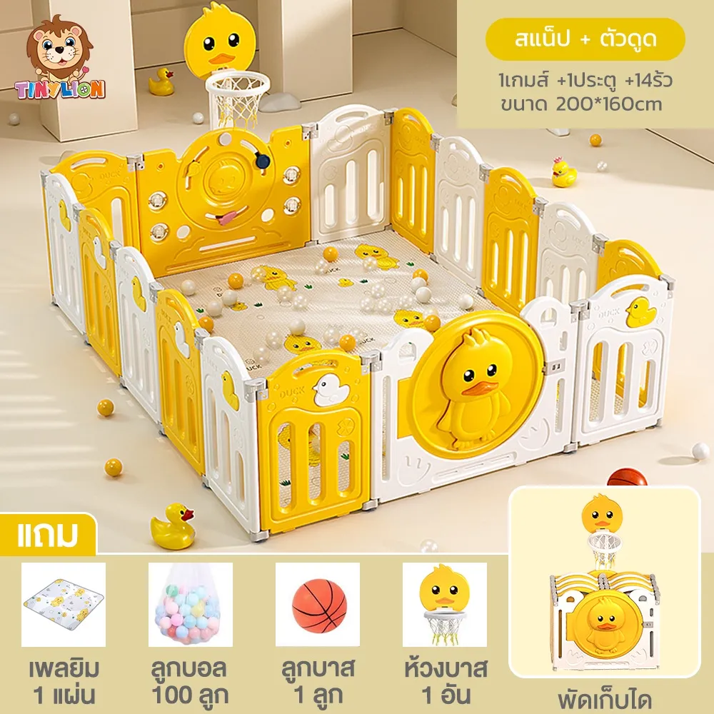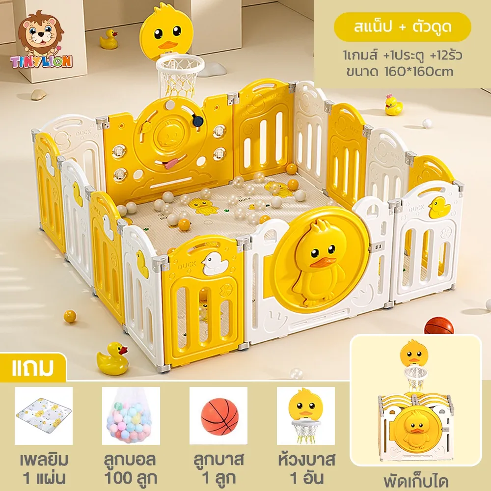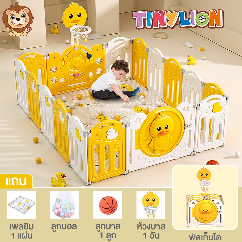 Tinylion คอกกั้นเด็ก คอกกั้นเกาหลี เปลี่ยนขนาด พับเก็บได้ ขนาด6.5ฟุต 5.2ฟุต พร้อม เพลยิม 1 แผ่น+ลูกบอลทะเลหลายลูก+ลูกบาส 1 ลูก+ห้วงบาสเก็ตบอล 1 อัน