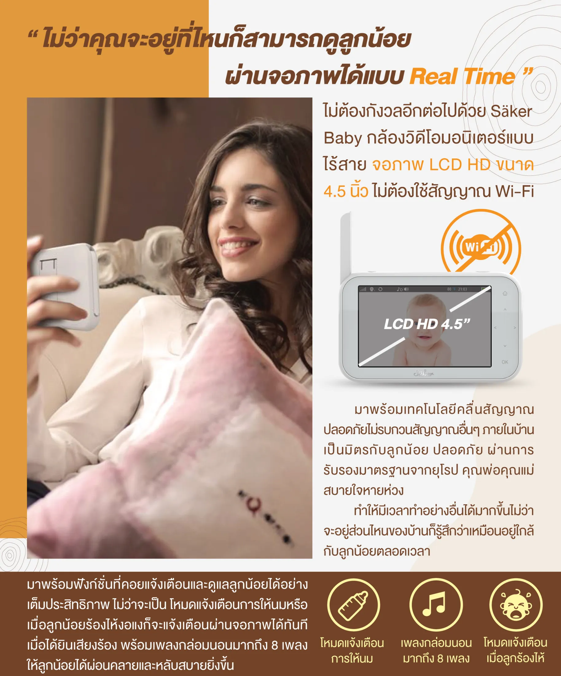 ทำให้มีเวลาทำอย่างอื่นได้มากขึ้นไม่ว่าจะอยู่ส่วนไหนของบ้านก็รู้สึกว่าเหมือนอยู่ใกล้กับลูกน้อยตลอดเวลา มาพร้อมฟังก์ชั่นที่คอยแจ้งเตือนและดูแลลูกน้อยได้อย่างเต็มประสิทธิภาพ