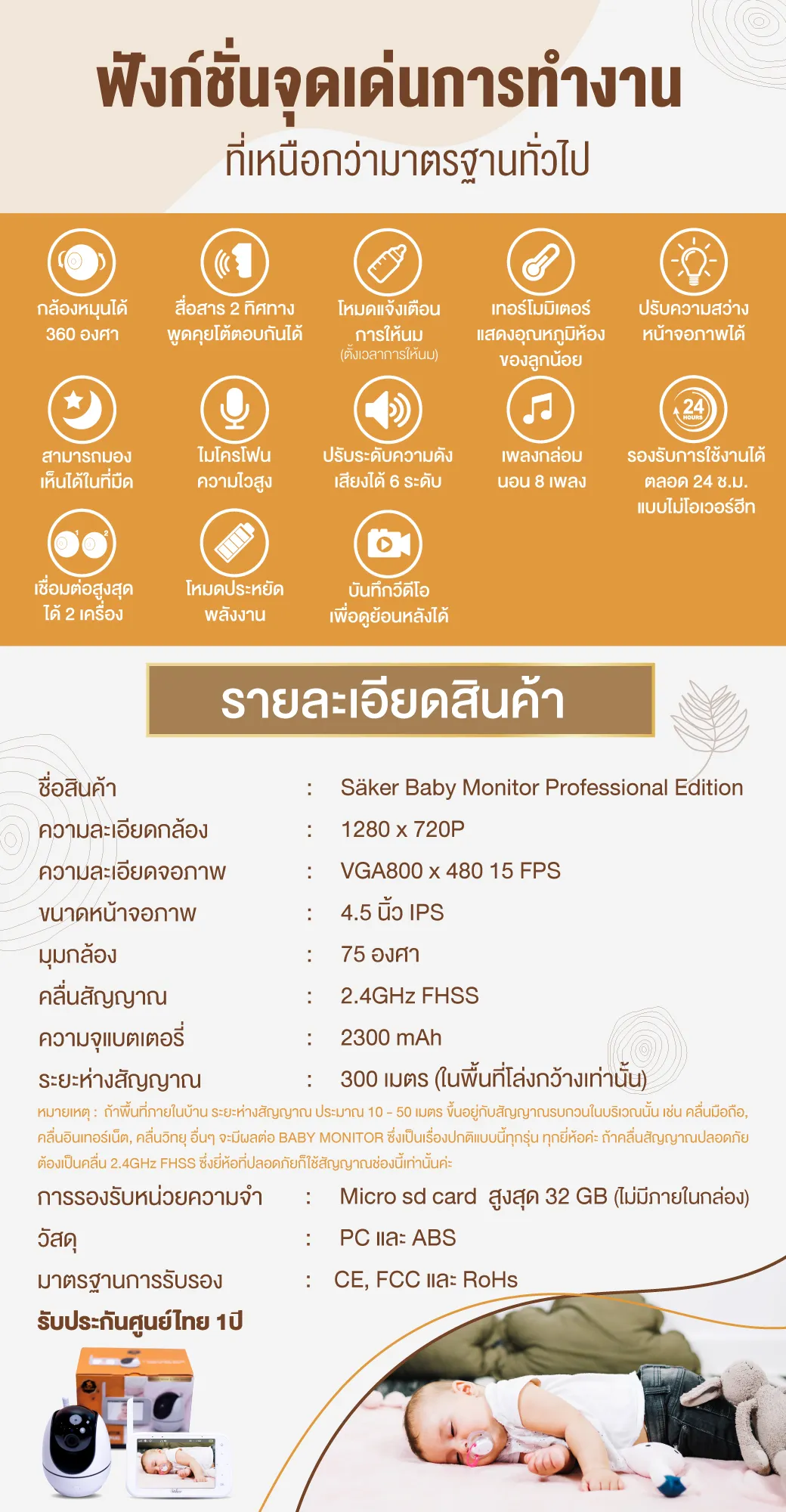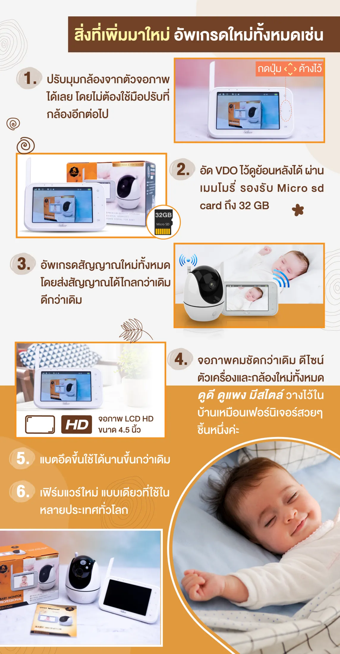 จากรุ่นก่อนหน้า เรานำความต้องการของคุณลูกค้าทั้งหมดมาปรับปรุง ใส่ฟังก์ชั่นมาให้ครบมากที่สุด ที่กล้องดูลูกน้อยควรจะต้องมี