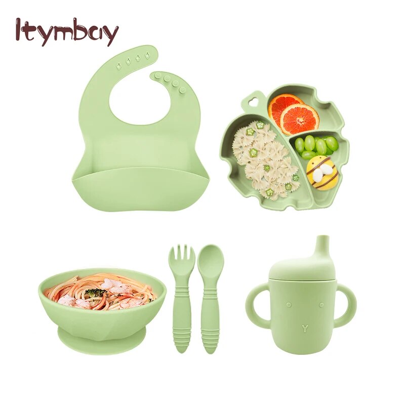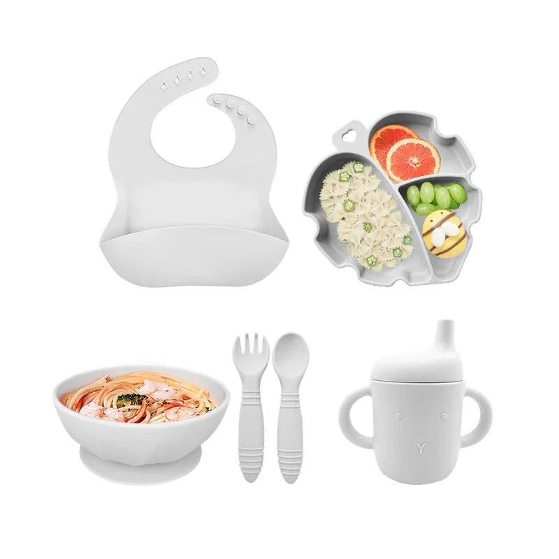 • ชุดให้นมบุตรซิลิโคนเด็ก6ชิ้น-ชุดอุปกรณ์บนโต๊ะอาหารสำหรับทารกและเด็กวัยหัดเดินเพื่อส่งเสริมผ้ากันเปื้อนเด็ก จานดูดแบ่ง, ชามดูด, แก้วหัดดื่ม, ผ้ากันเปื้อนแบบปรับได้, ช้อนซิลิโคนและส้อม