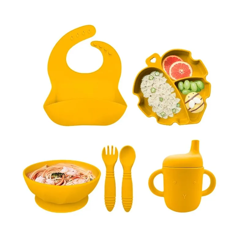 F1258 Gniermaoyiyou ชุดให้อาหารทารกซิลิโคน6ชิ้นพร้อมถ้วยดูดผ้ากันเปื้อนแบบปรับได้จานถาดหลุมและหลอดใช้ดื่มถ้วยส้อมช้อนสำหรับเด็กวัยหัดเดิน