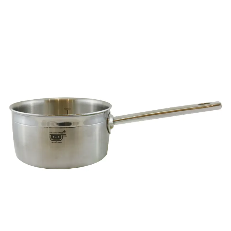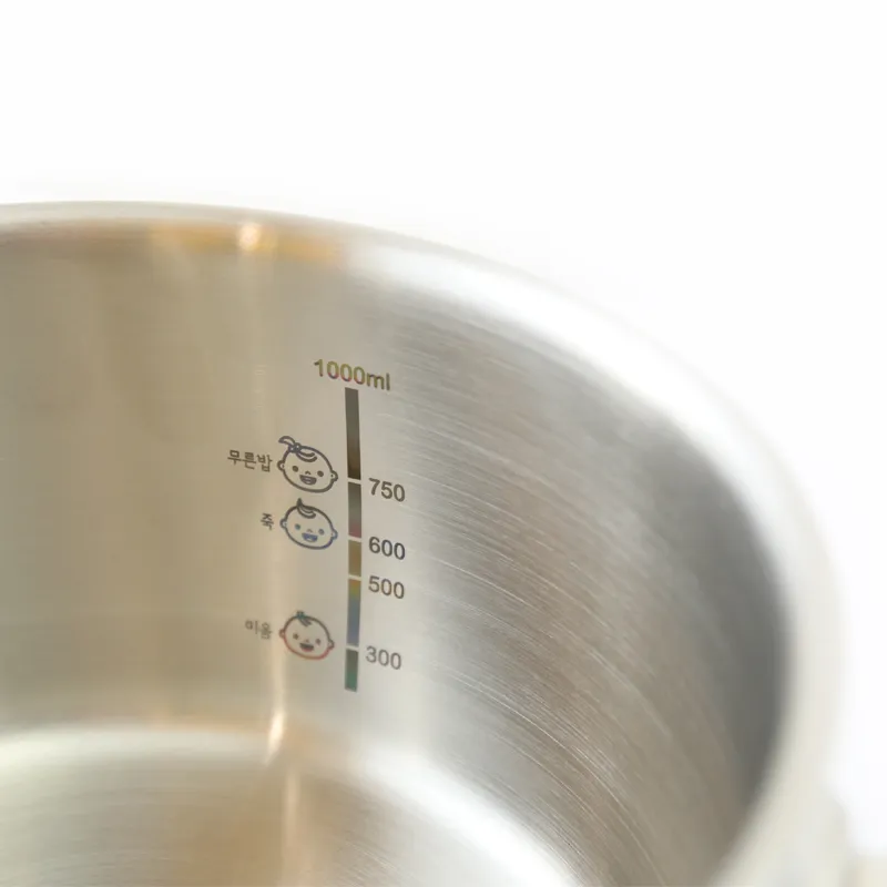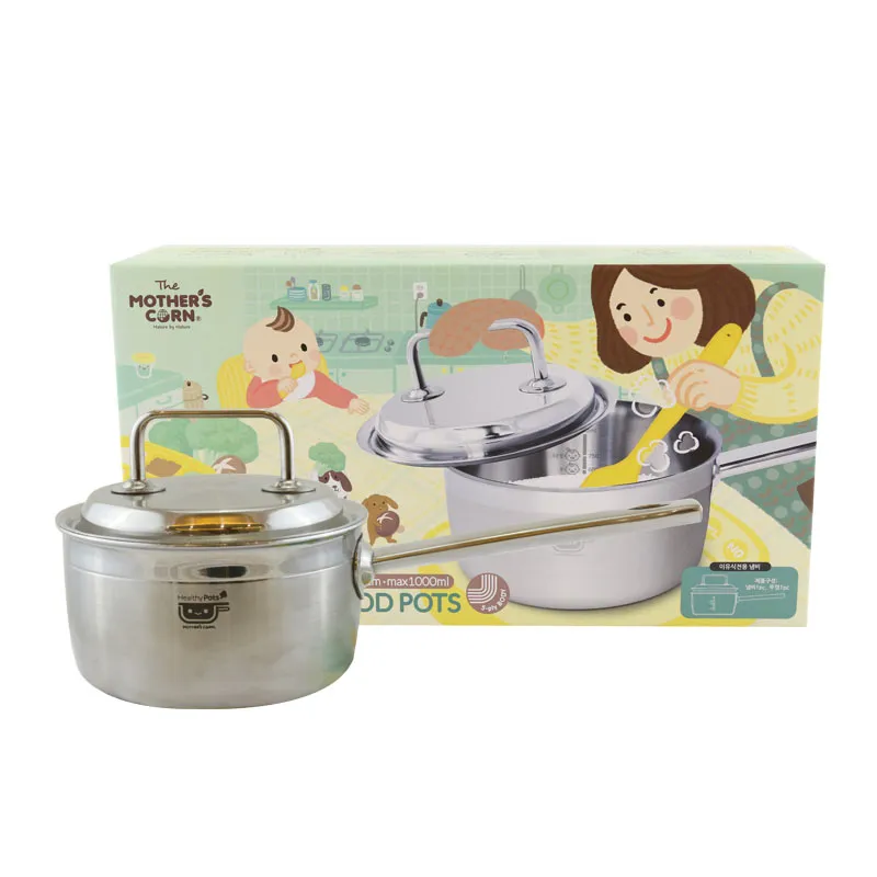 หม้อสำหรับทำอาหารเด็ก ผลิตจากสแตนเลสสตีลคุณภาพสูง 5 ชั้น หนา 2.5 mm ปลอดภัย ไม่มีสารพิษปนเปื้อนไปในอาหาร ผลิตที่ประเทศเกาหลีโดยใช้เทคโนโลยีจากบริษัท Altenbach ผู้ผลิตเครื่องครัวสแตนเลสจากประเทศเยอรมนี นำความร้อนสูง ร้อนเร็ว ประหยัดพลังงาน สามารถใช้ได้กับเตาทุกชนิด รวมถึงเตาแม่เหล็กไฟฟ้า (Induction Cooker) มีหน่วยวัดบอกปริมาณชัดเจนบริเวณด้านในของหม้อ สามารถเทอาหารออกได้ทุกทิศทางโดยไม่หกเลอะก้นหม้อ ฝาหม้อและด้ามจับเชื่อมติดกับตัวหม้อ แข็งแรงทนทานและไม่ร้อน สามารถจับได้อย่างปลอดภัยขณะใช้งาน มีรูระบายไอน้ำที่ฝาหม้อ จุดของเหลวได้ 1,000 มล. แนะนำให้ใช้งานคู่กับอุปกรณ์เสริมหม้อ Healthy Pot (สำหรับอุ่นอาหาร) ของ Mother’s Corn