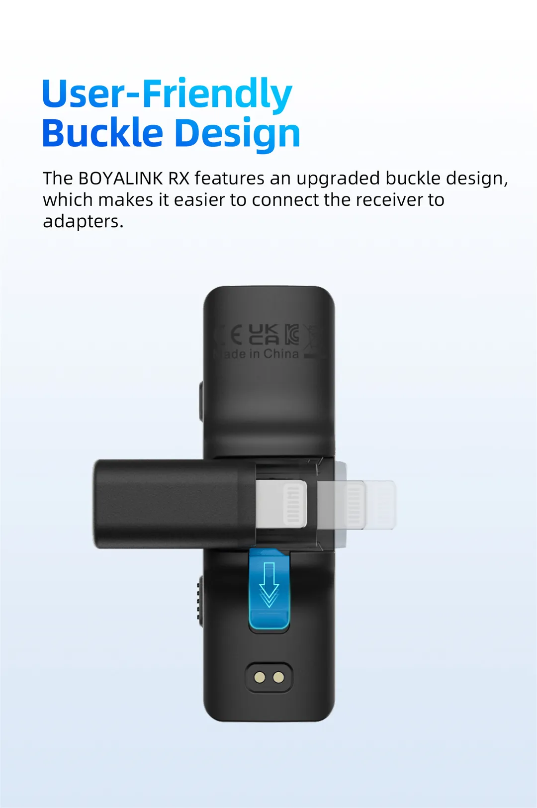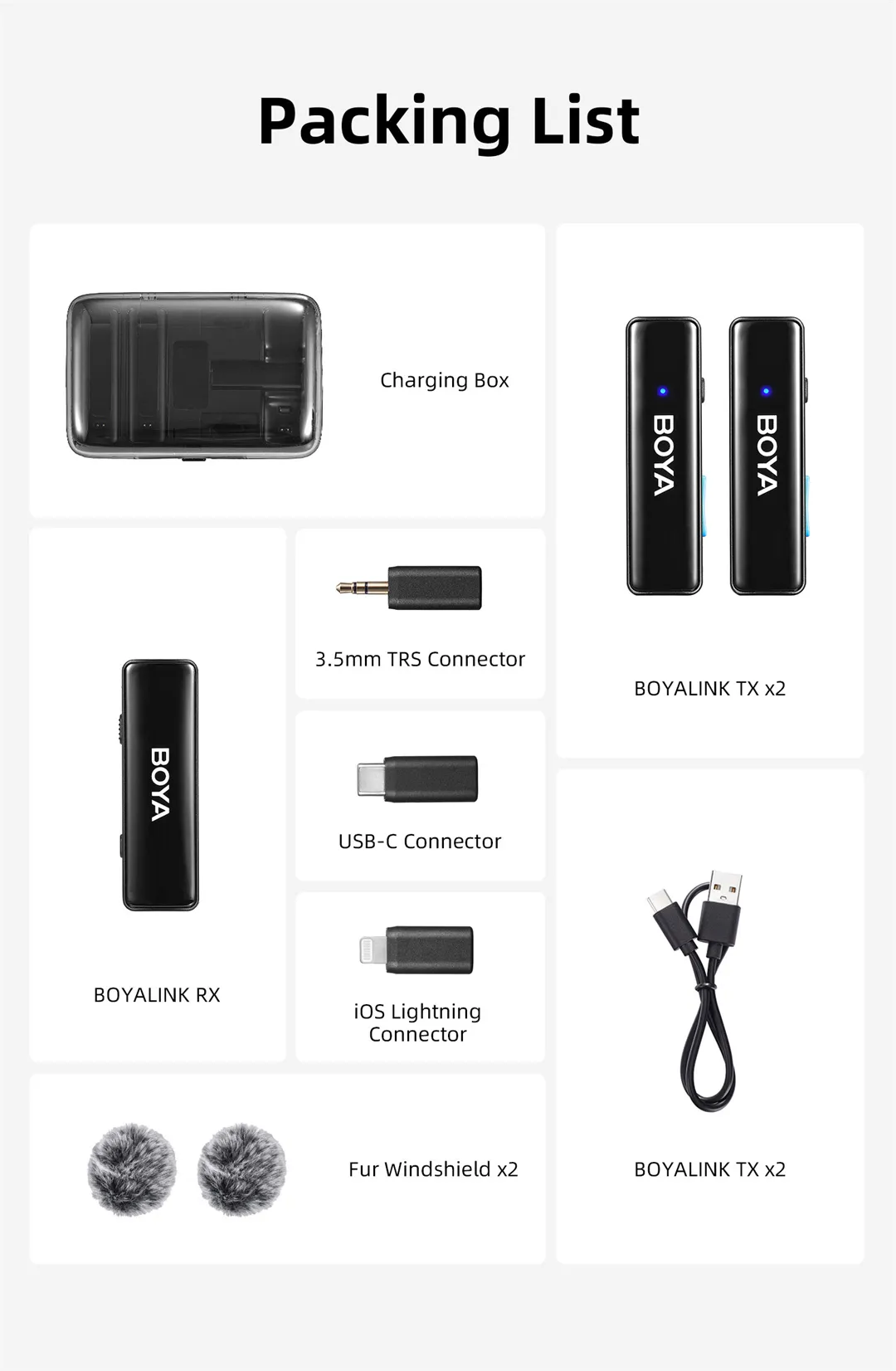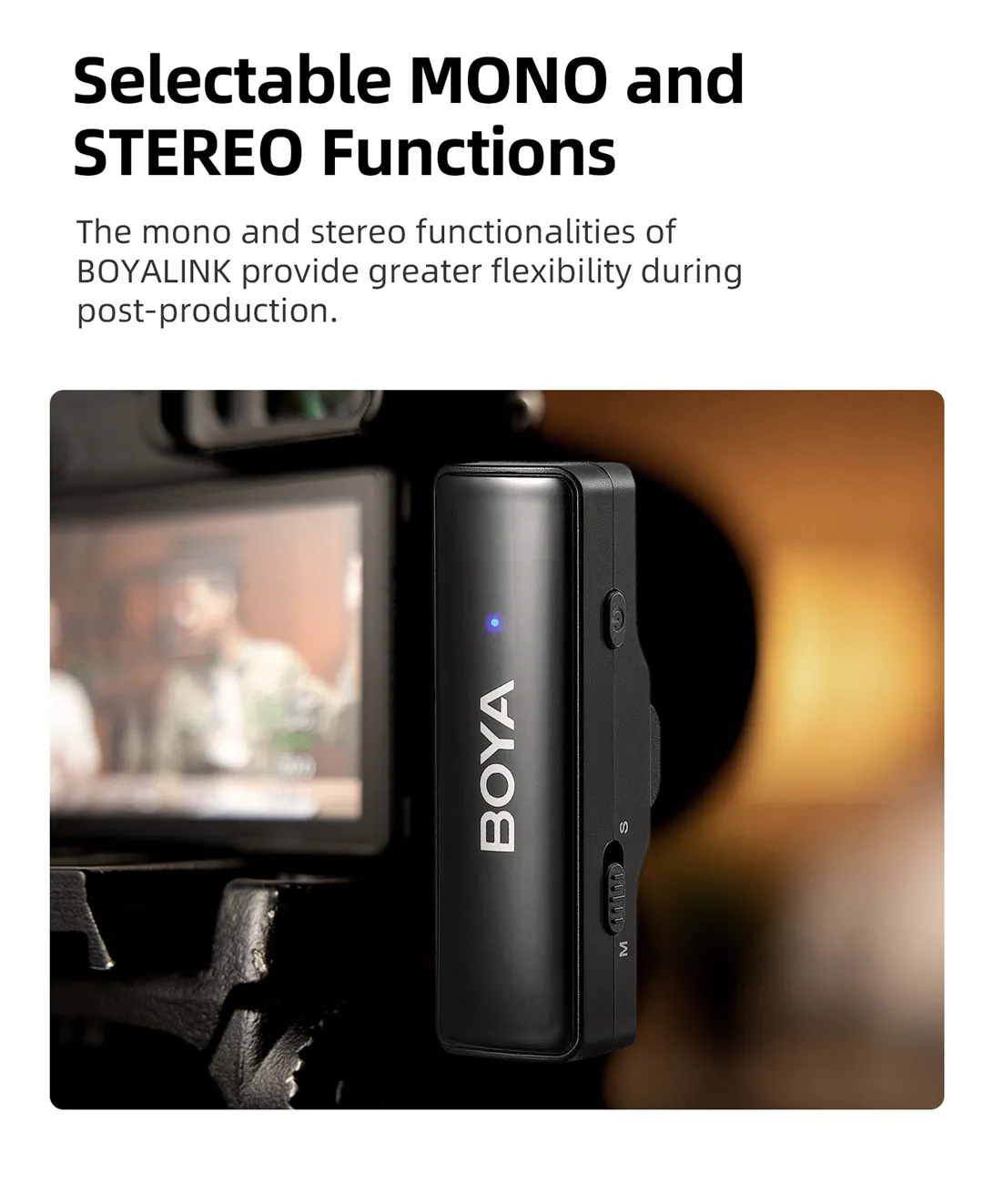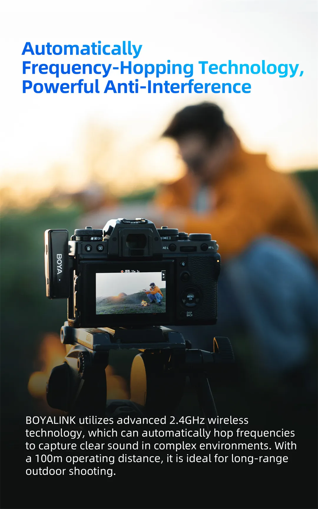 Boyalink เป็นระบบโทรศัพท์ไร้สายขนาด2.4กิกะเฮิร์ตซ์ขนาดกะทัดรัดและพกพาได้เข้ากันได้กับกล้องสมาร์ทโฟนแท็บเล็ตและอีกมากมายคอมพิวเตอร์มันมาพร้อมกับการจับคู่อัตโนมัติและการลดเสียงรบกวนที่สามารถเลือกได้ให้เสียงคุณภาพการออกอากาศที่ง่ายต่อการใช้งาน boyalink เหมาะสำหรับการสร้างเนื้อหา, การสตรีมสด, การบล็อก, การสื่อสารมวลชนบนมือถือและอื่นๆอีกมากมาย