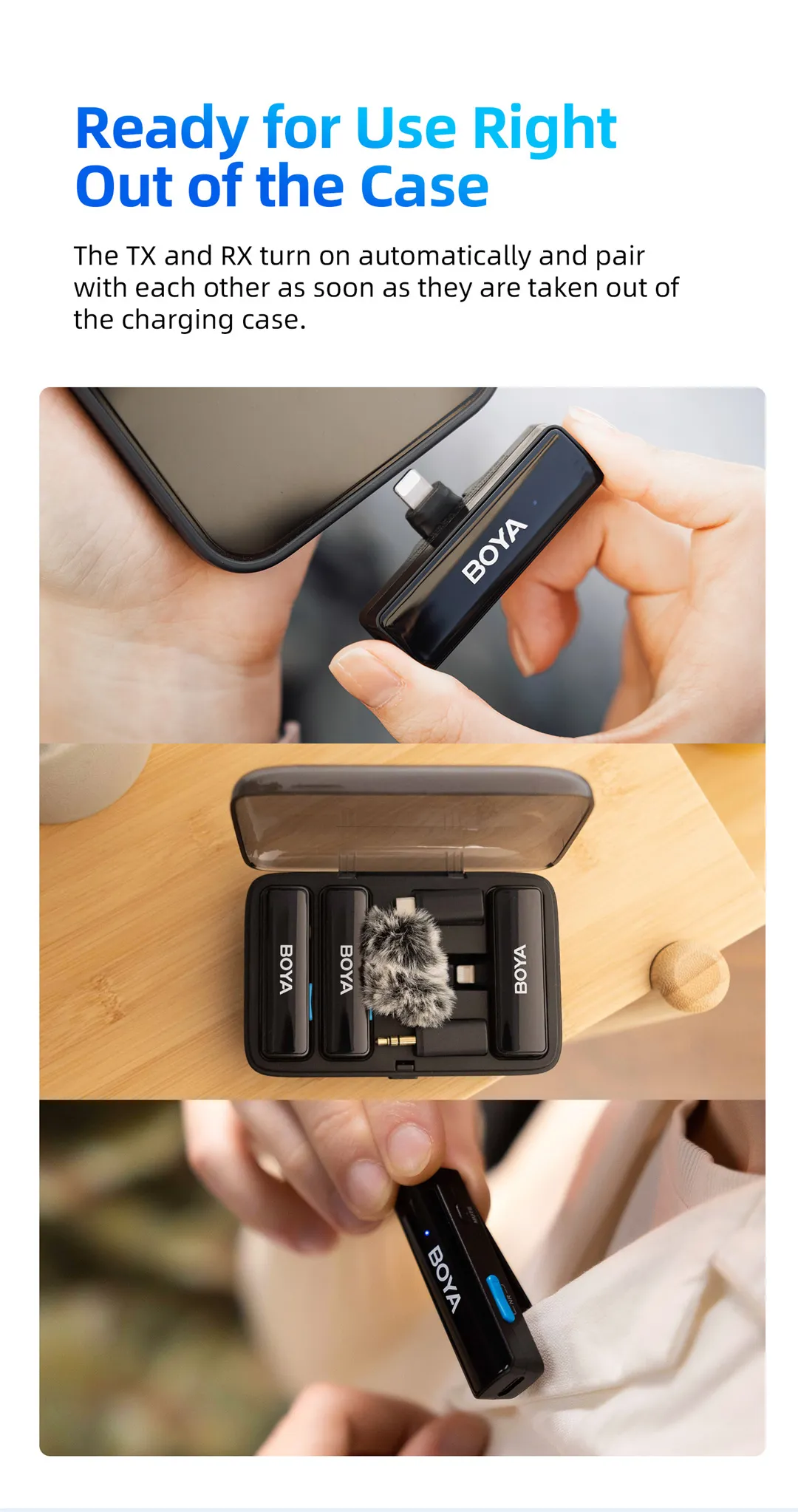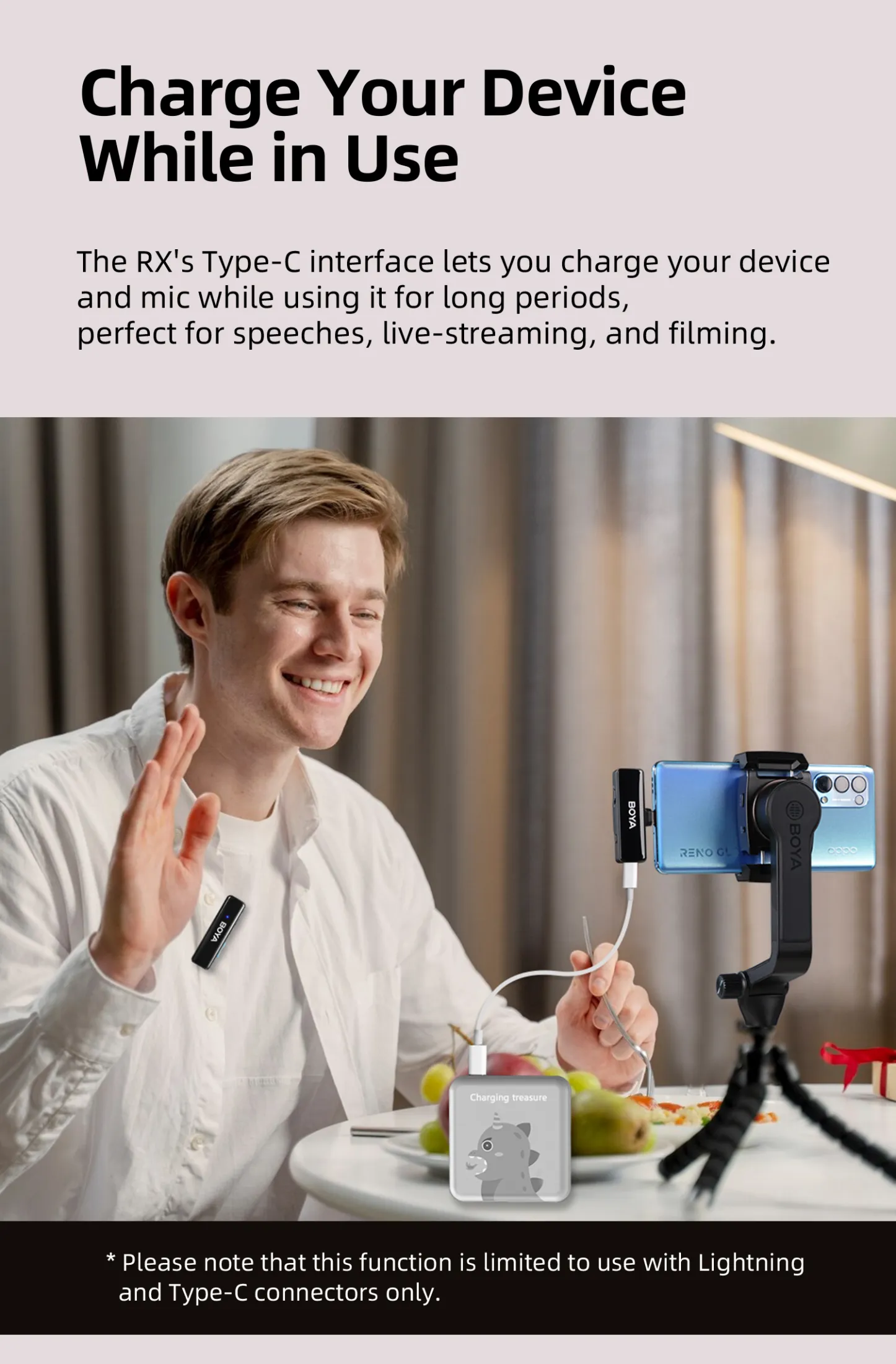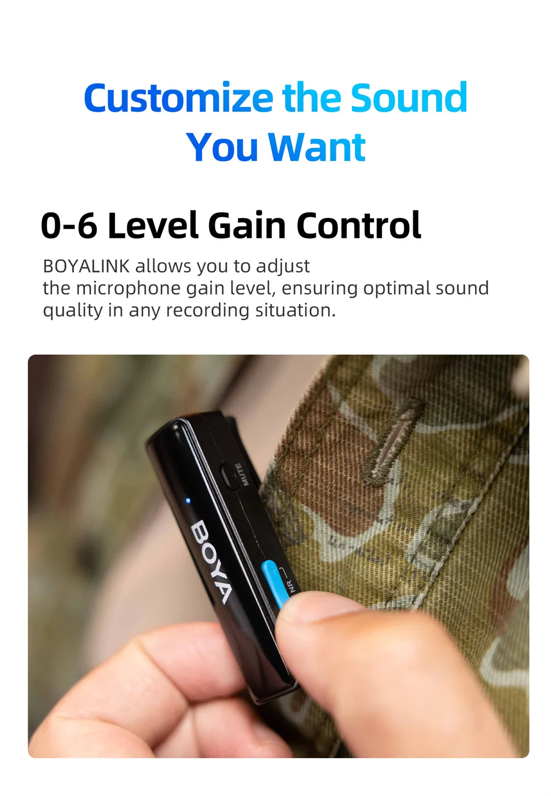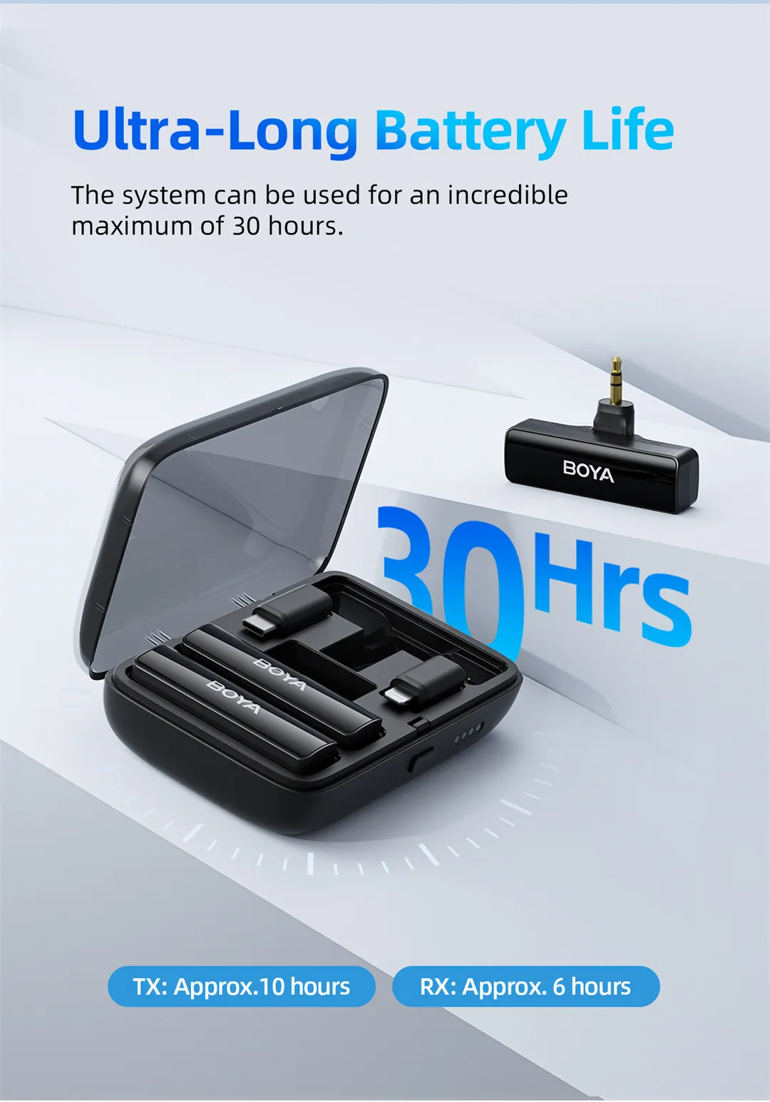 Boyalink เป็นระบบโทรศัพท์ไร้สายขนาด2.4กิกะเฮิร์ตซ์ขนาดกะทัดรัดและพกพาได้เข้ากันได้กับกล้องสมาร์ทโฟนแท็บเล็ตและอีกมากมายคอมพิวเตอร์มันมาพร้อมกับการจับคู่อัตโนมัติและการลดเสียงรบกวนที่สามารถเลือกได้ให้เสียงคุณภาพการออกอากาศที่ง่ายต่อการใช้งาน boyalink เหมาะสำหรับการสร้างเนื้อหา, การสตรีมสด, การบล็อก, การสื่อสารมวลชนบนมือถือและอื่นๆอีกมากมาย
