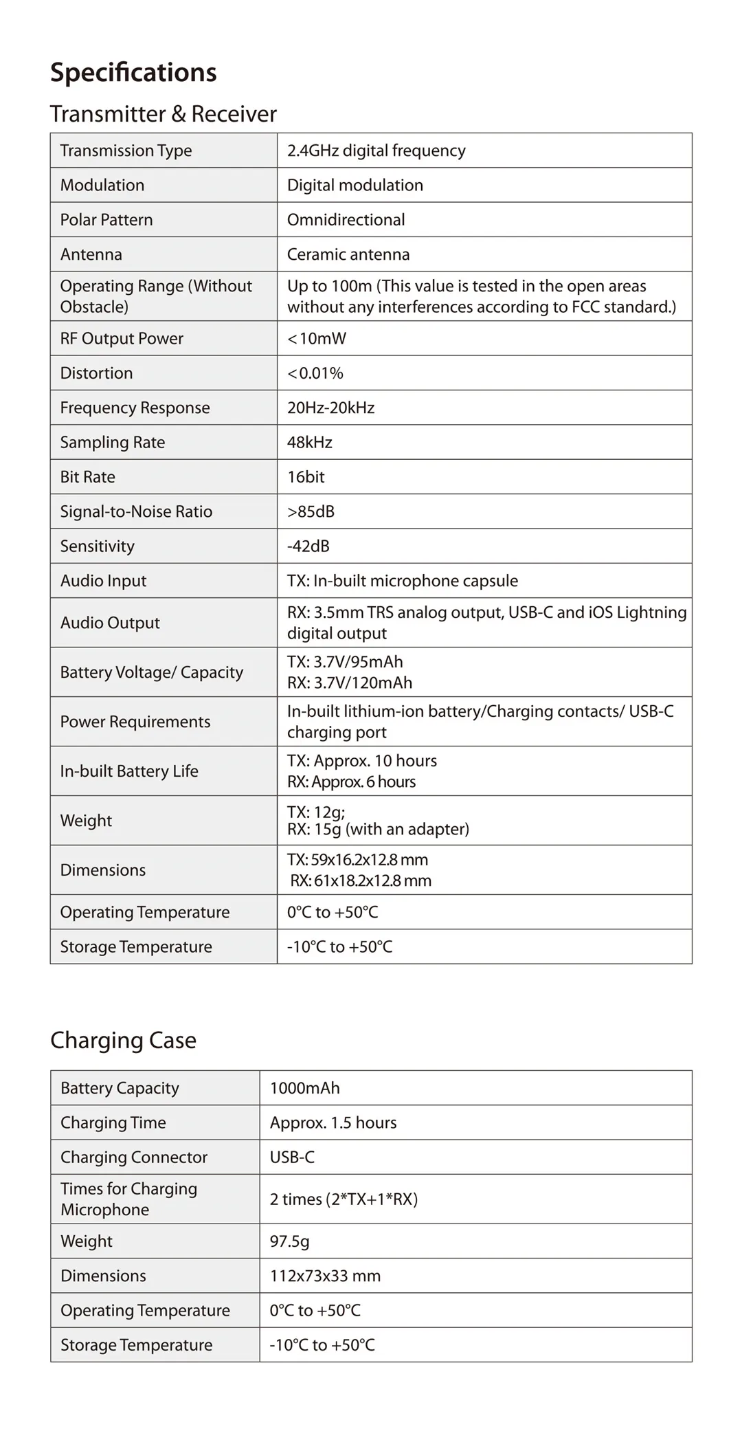 มี3อะแดปเตอร์ที่แตกต่างกันในชุด: TRS 3.5mm, USB-C และ iOS Lightning. ตัวรับมีชาร์จพอร์ต USB-C ที่รองรับชาร์จและจ่ายไฟให้กับอุปกรณ์ในขณะที่ใช้งานกับอะแดปเตอร์ USB-C/ฟ้าผ่า