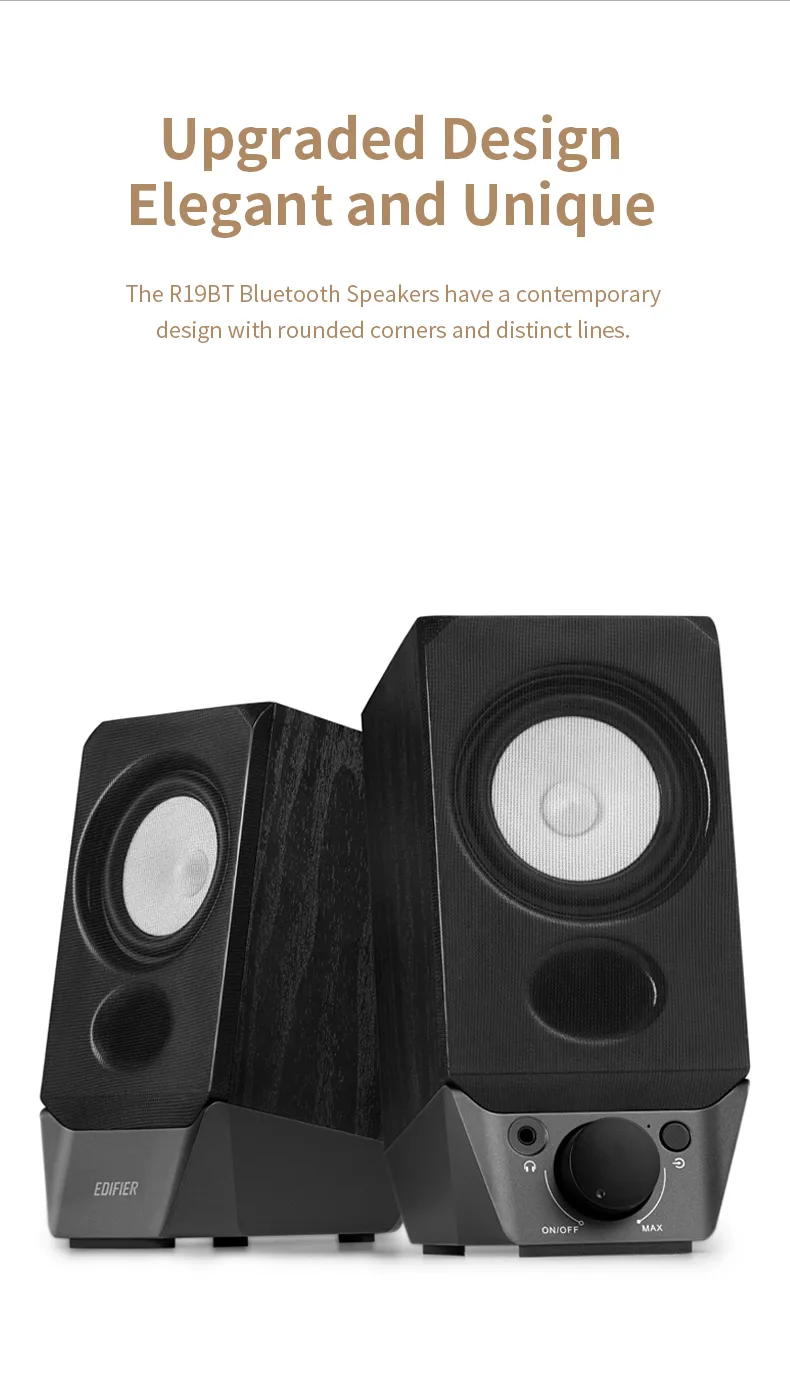 - R19BT Bluetooth Speakers have a contemporary design with rounded corners and distinct lines.