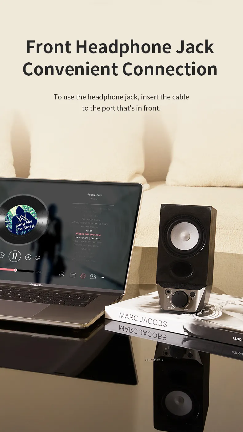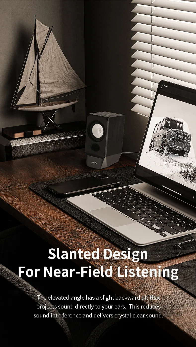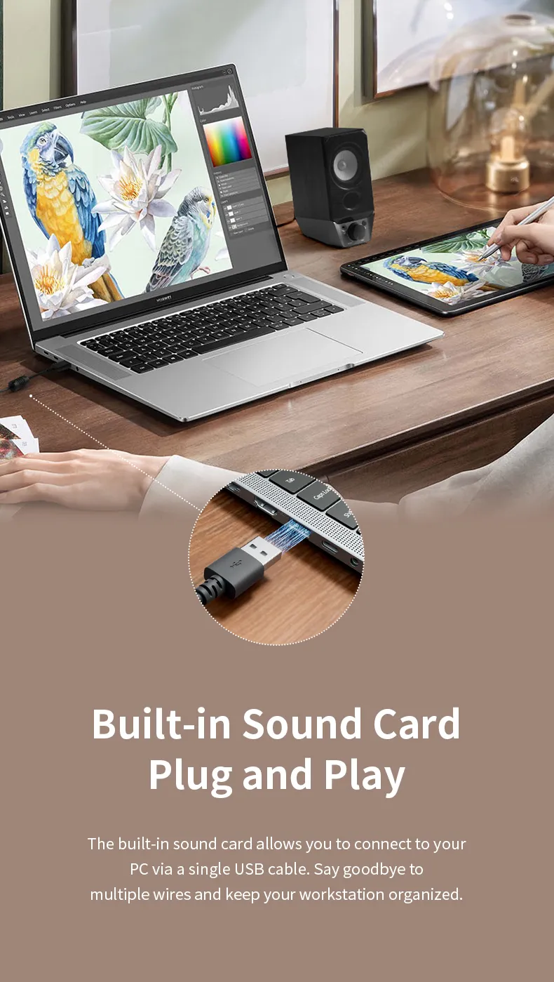 The built-in sound card allows you to connect to your PC via a single USB cable. Say goodbye to multiple wires and keep your workstation organized.