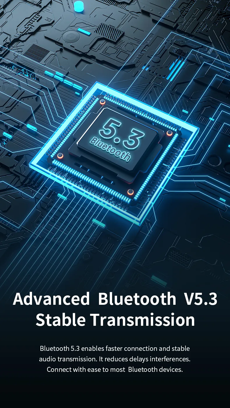 Bluetooth 5.3 enables faster connection and stable audio transmission. It reduces delays interferences. Connect with ease to most Bluetooth devices.