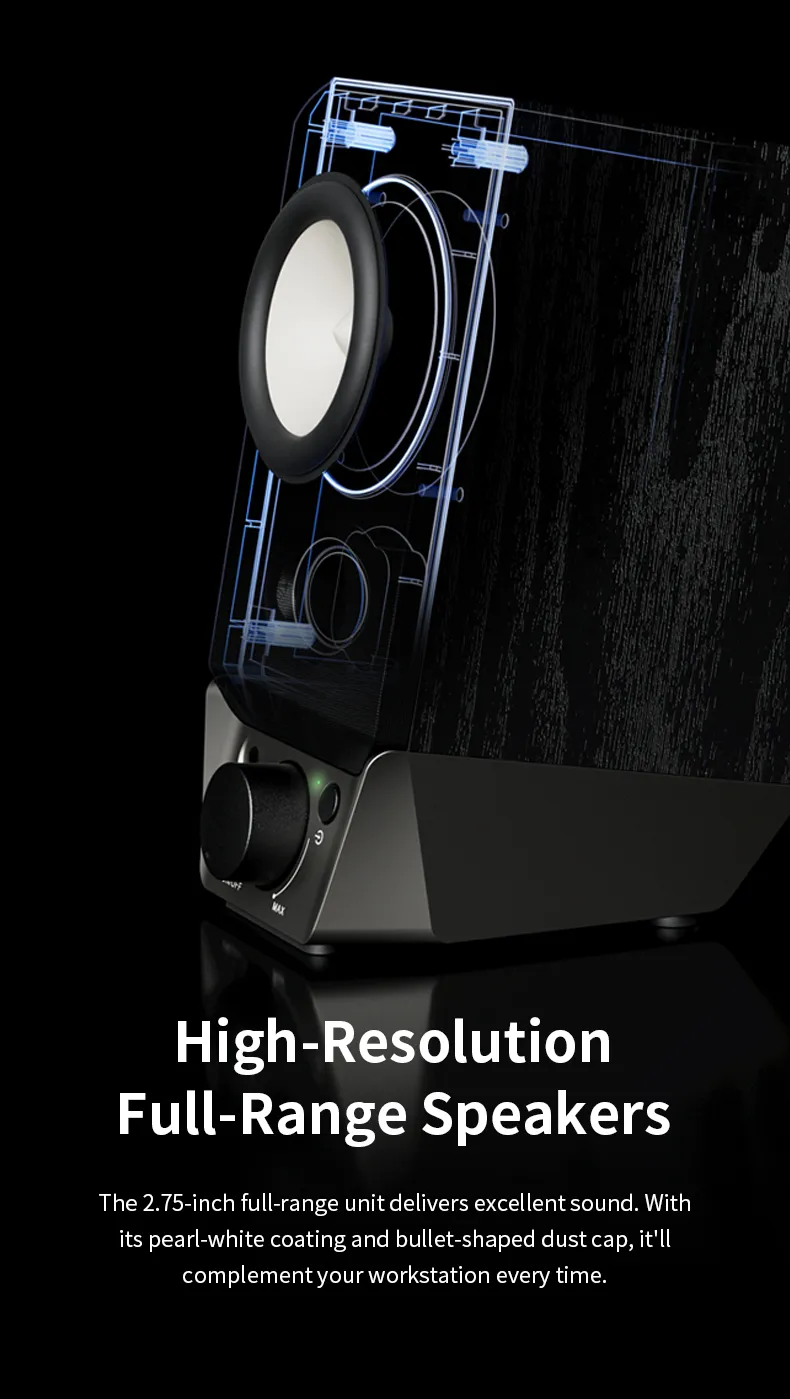 The 2.75-inch full-range unit delivers excellent sound. With its pearl-white coating and bullet-shaped dust cap, it’ll complement your workstation every time.