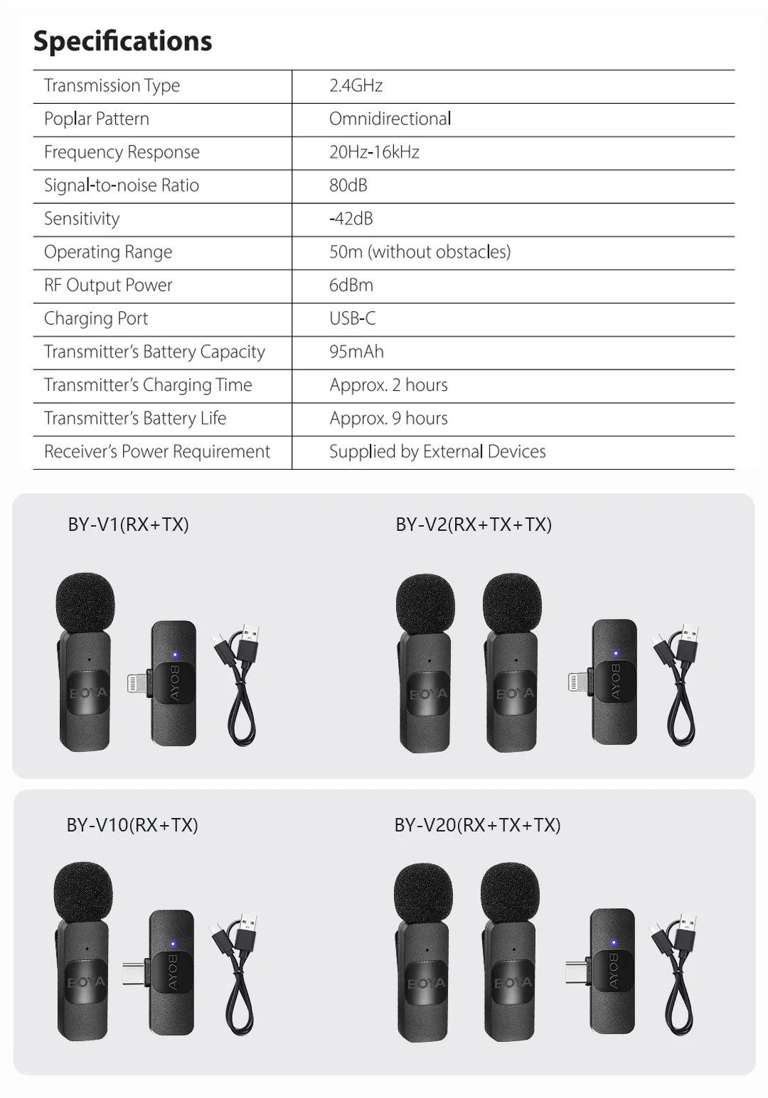 ซีรีย์ BY-V เป็นระบบไมโครโฟนไร้สายขนาดเล็ก2.4GHz ที่ให้เสียงคุณภาพสูงสำหรับการสตรีมสดวิดีโอบล็อกการบันทึกหลักสูตรและการบันทึกแอปจับภาพเสียงอื่นๆด้วยเอาต์พุต Lightning ที่ผ่านการรับรอง MFI