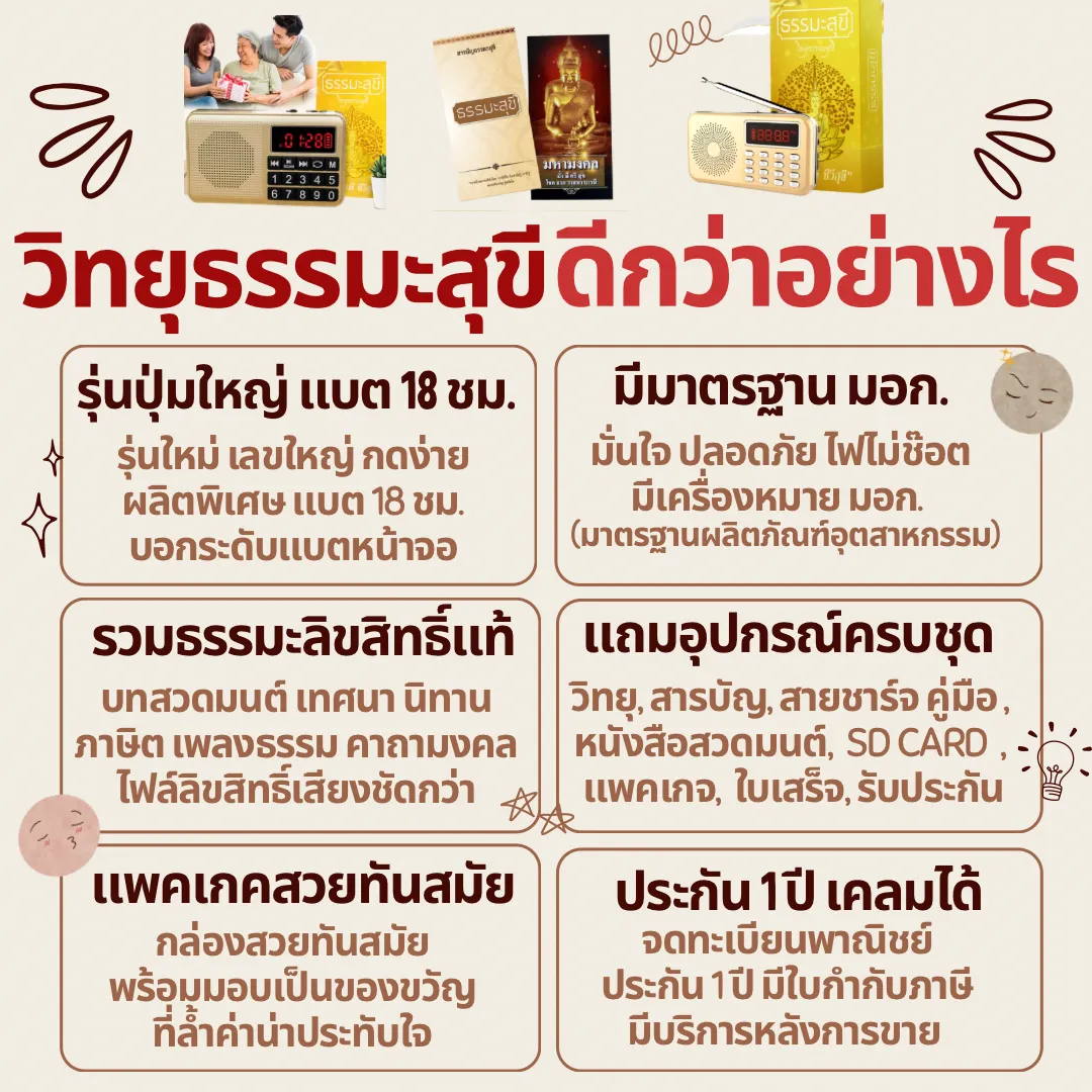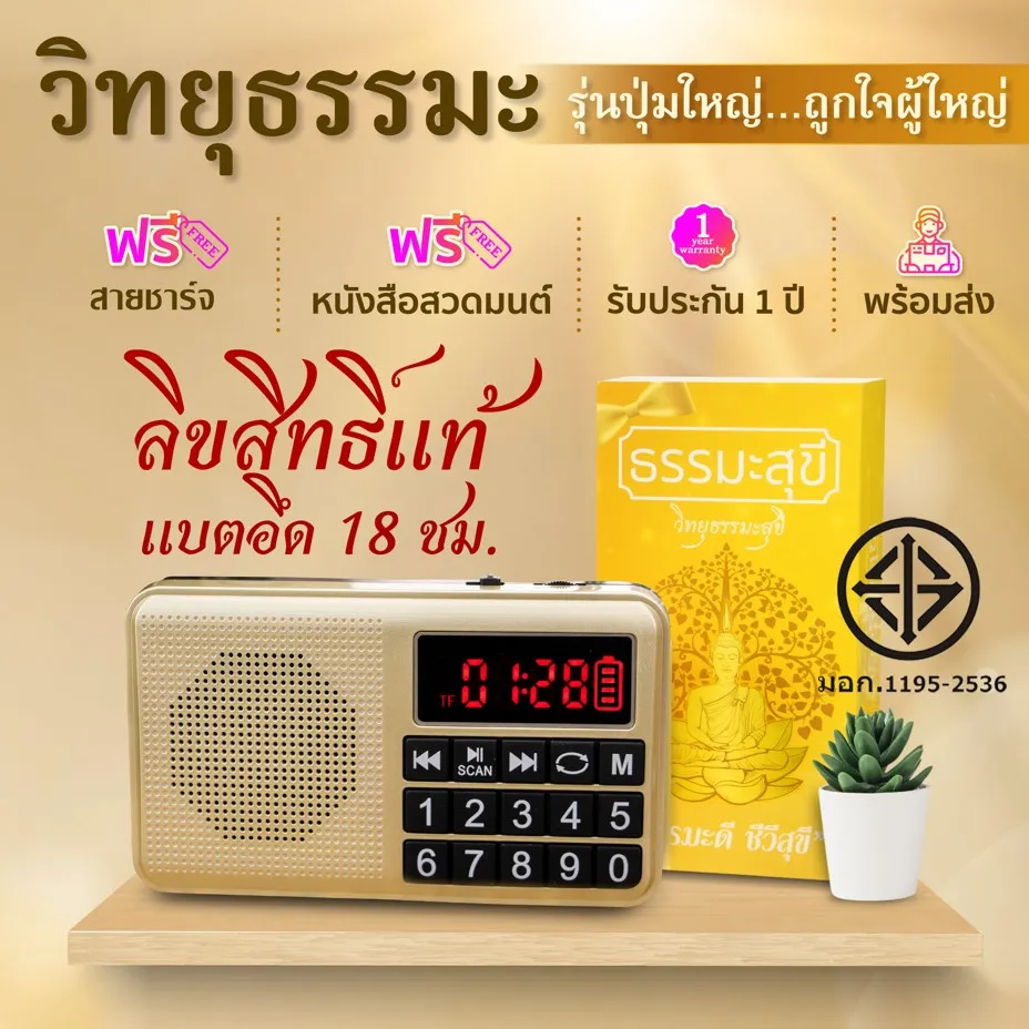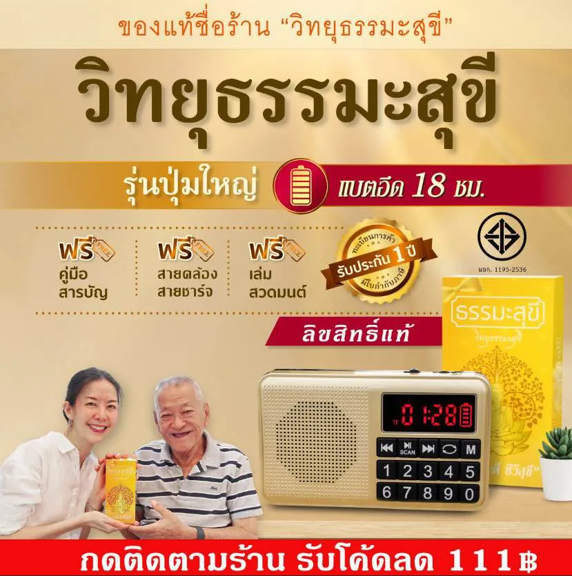 - วิทยุธรรมะสุขีปุ่มใหญ่ลิขสิทธิ์แท้ มี มอก. แบตนาน 18 ชม. บทสวดมนต์ เทศนา คาถามงคล นิทาน เพลงบำบัด แพคเกจสวย ประกัน1ปี *ร้านจดทะเบียน มีใบกำกับภาษี เนื่องจากมีคนนำภาพจากร้านไปใช้แอบอ้าง วิธีสังเกตของแท้ง่าย ๆ ต้องชื่อร้าน วิทยุธรรมะสุขี เท่านั้น