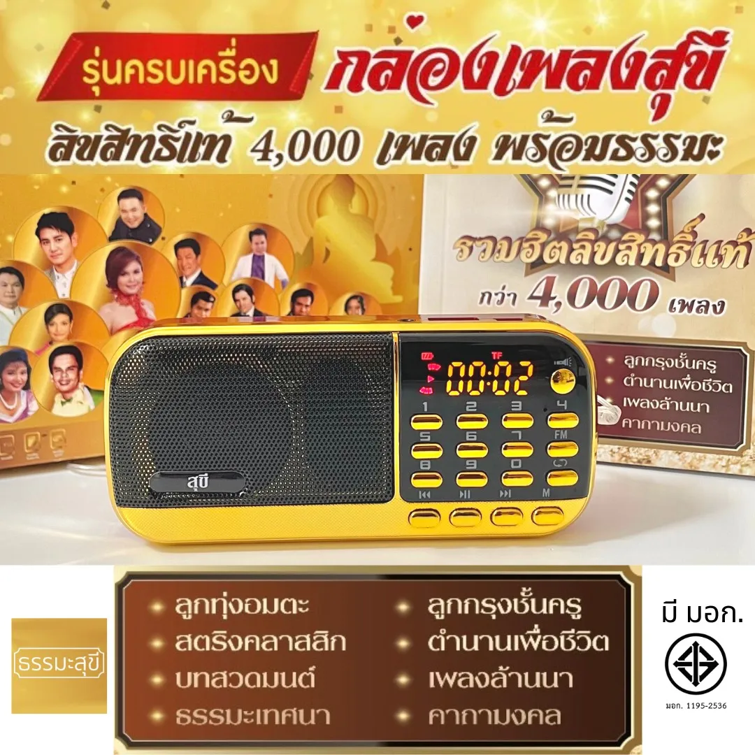 รวมเพลงฮิตลิขสิทธิ์แท้ และบทสวดมนต์ คัดสรรคุณภาพ ลิขสิทธิ์แท้กว่า 4,000 เพลง รวมศิลปินลูกทุ่ง ลูกกรุง สตริง เพื่อชีวิต กว่า 126 ท่านบทสวดธรรมะและคาถาศักดิ์สิทธิ์กว่า 300 บท กล่องเพลงสุขีอัดแน่นคุณภาพ ทั้งลูกทุ่ง ลูกกรุง สตริงเก่า เพื่อชีวิต เพลงคำเมือง พร้อมทั้งบทสวดมนต์ ธรรมะเทศนา ในเครื่องเดียว และต้องการให้เครื่องเดียวสามารถตอบโจทย์การใช้งานได้ทุกโหมดอารมณ์