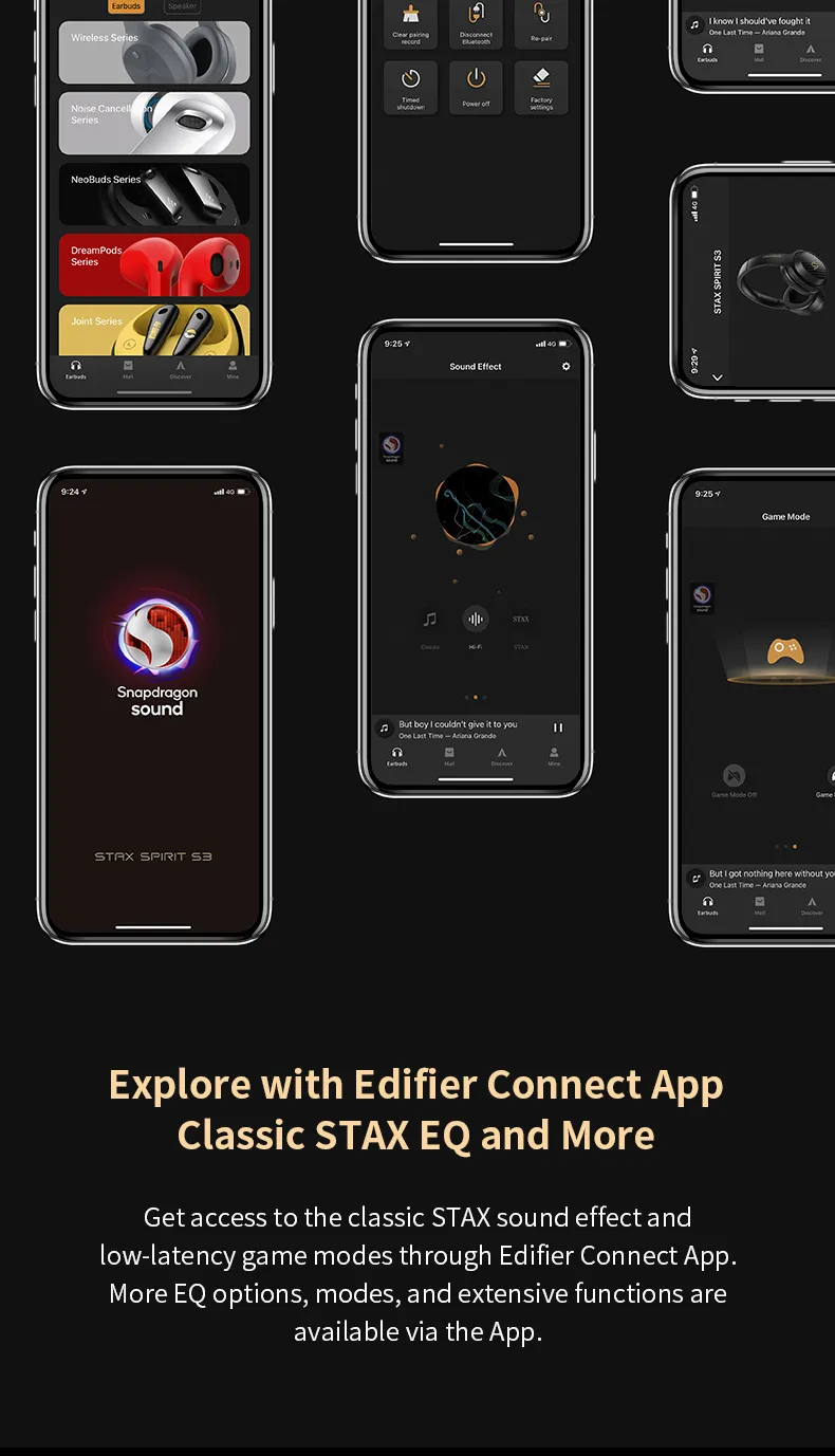 • Edifier Connect App:Enable a variety of advanced functionality-customized EQ setting, control setting, cushion setting, etc.