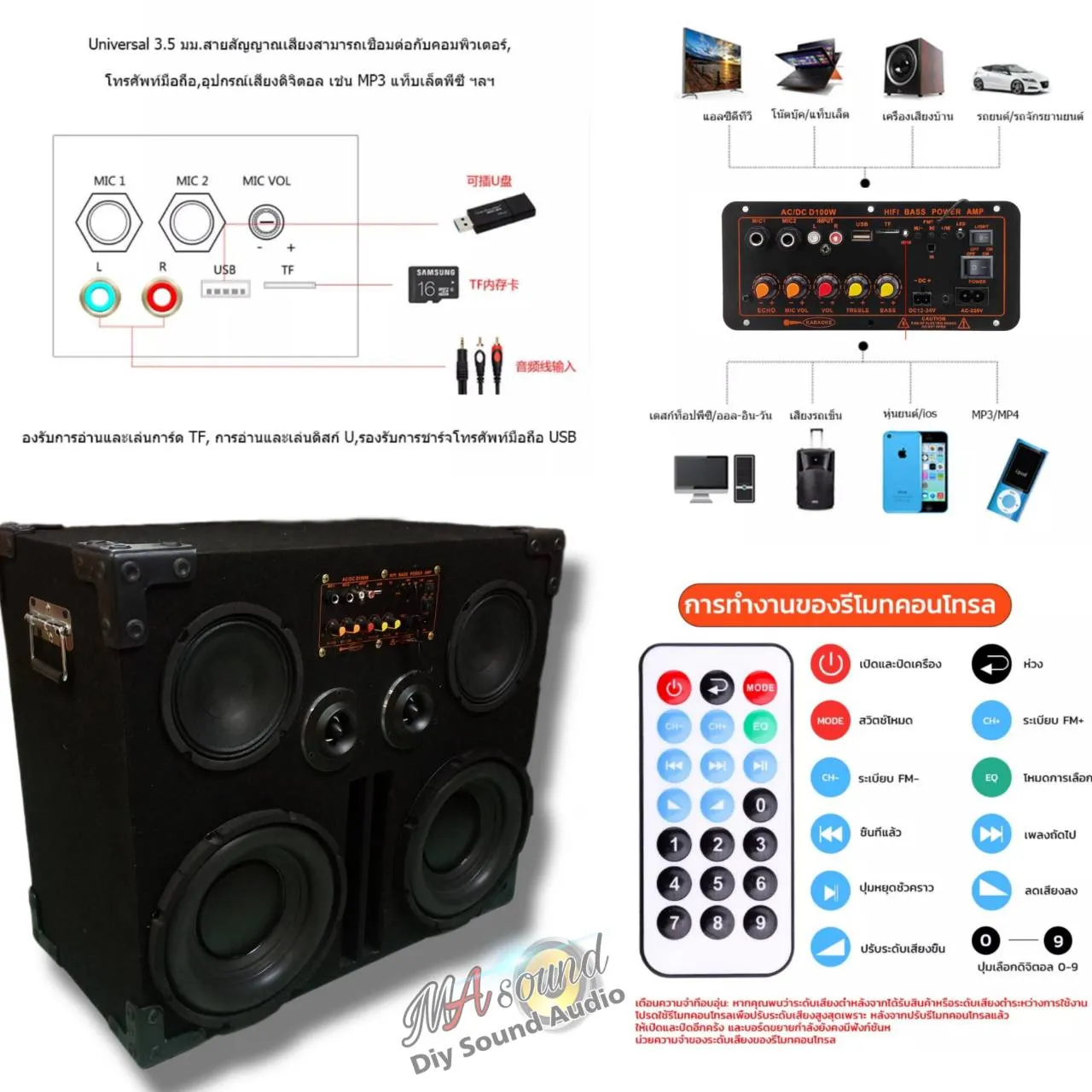 -รองรับ บลูทูธ/RCA จากมือถือ/DVD/FM/EQ……