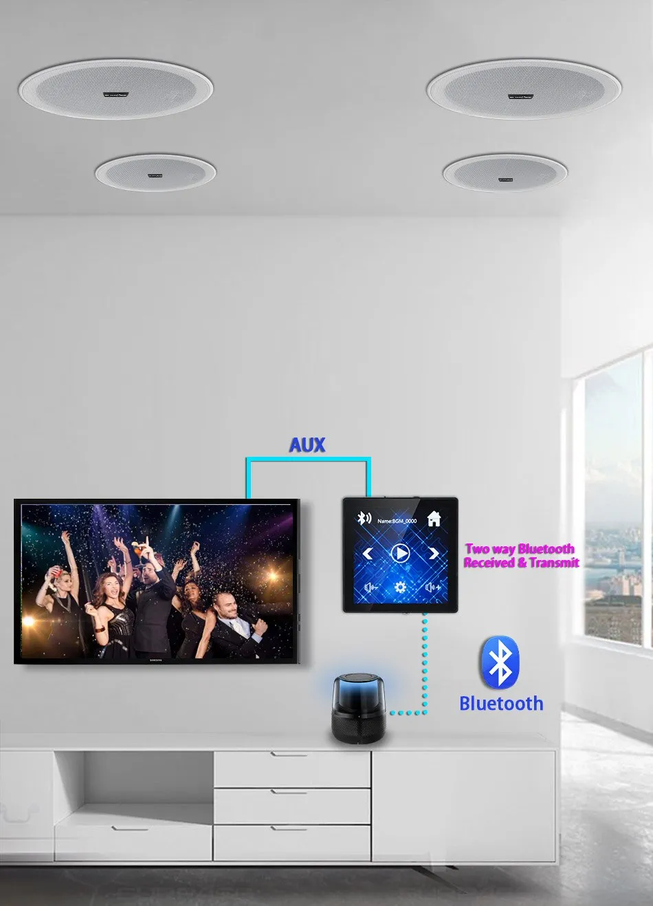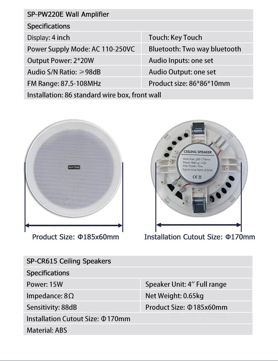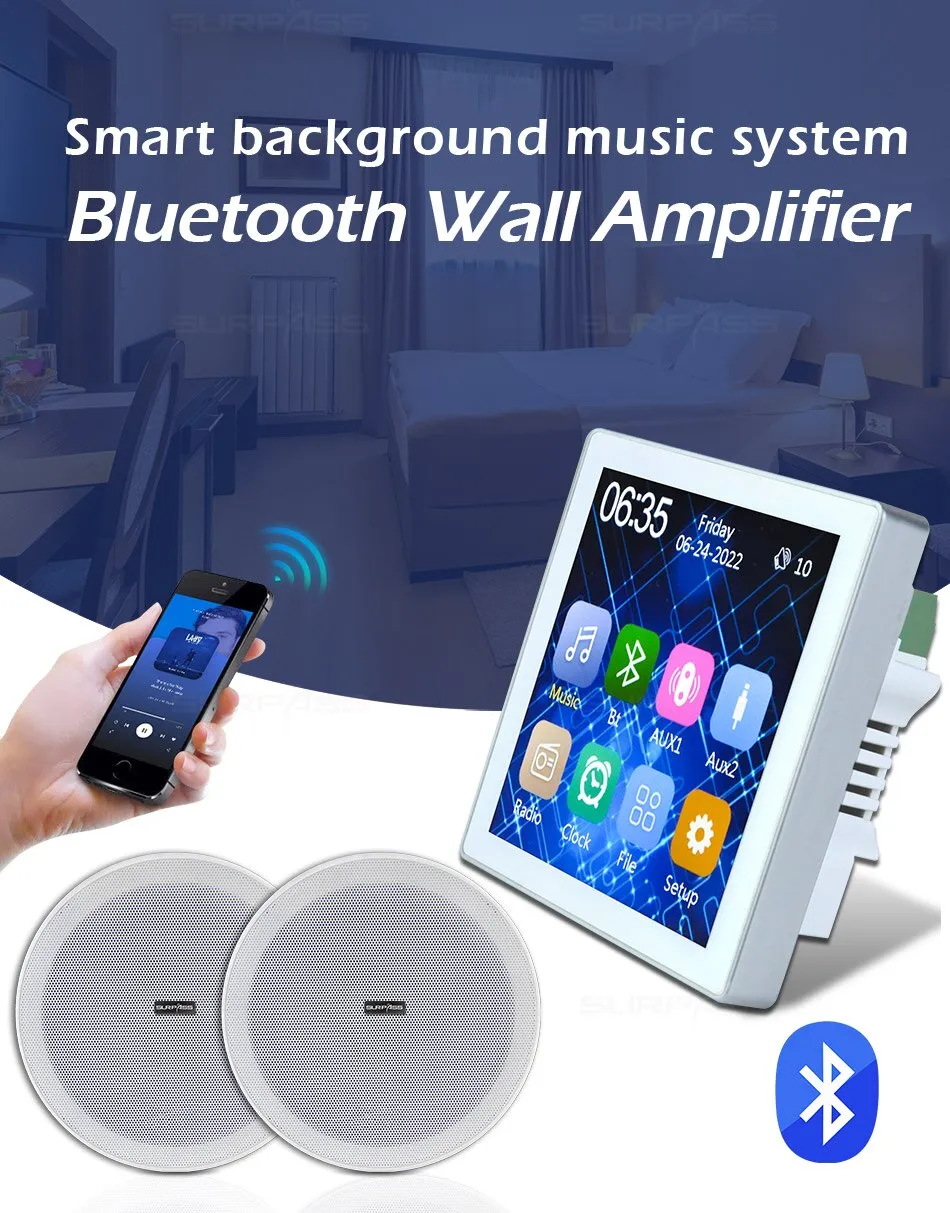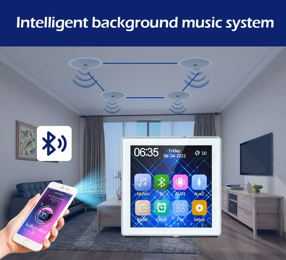 สมาร์ทโฮมเธียเตอร์ระบบเพลงพื้นหลังเครื่องขยายเสียงติดผนังขนาดเล็ก เครื่องขยายเสียงบลูทูธ หน้าจอสัมผัสพร้อมชุดลำโพงสเตอริโอเพดานขนาด 6 นิ้ว