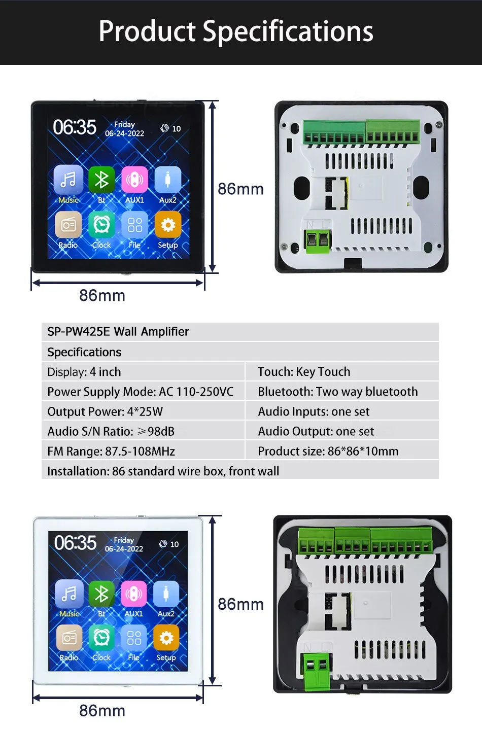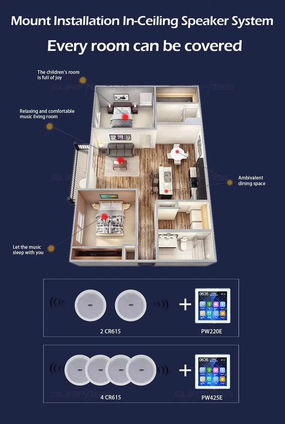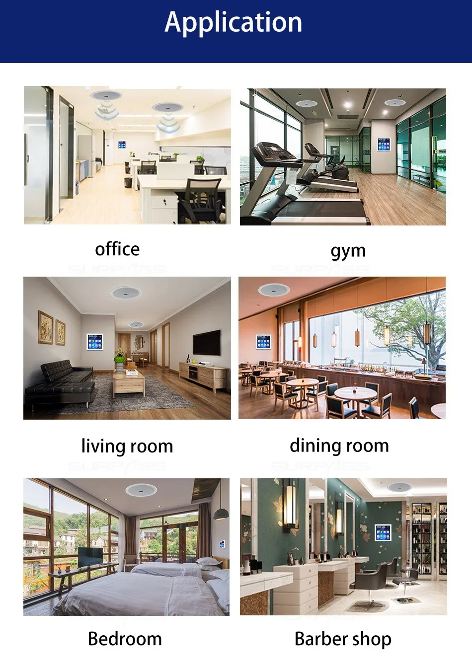 สมาร์ทโฮมเธียเตอร์ระบบเพลงพื้นหลังเครื่องขยายเสียงติดผนังขนาดเล็ก เครื่องขยายเสียงบลูทูธ หน้าจอสัมผัสพร้อมชุดลำโพงสเตอริโอเพดานขนาด 6 นิ้ว
