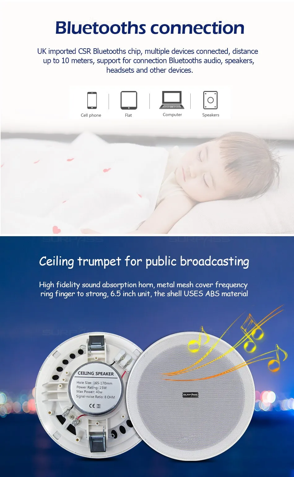 ข้อมูลจำเพาะของลำโพงเพดานไร้กรอบขนาด 6 นิ้ว: