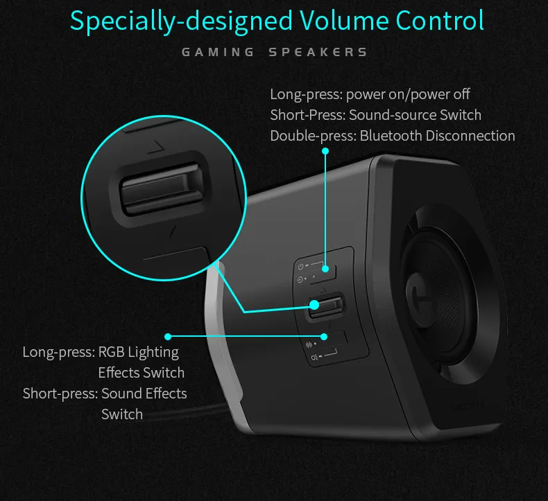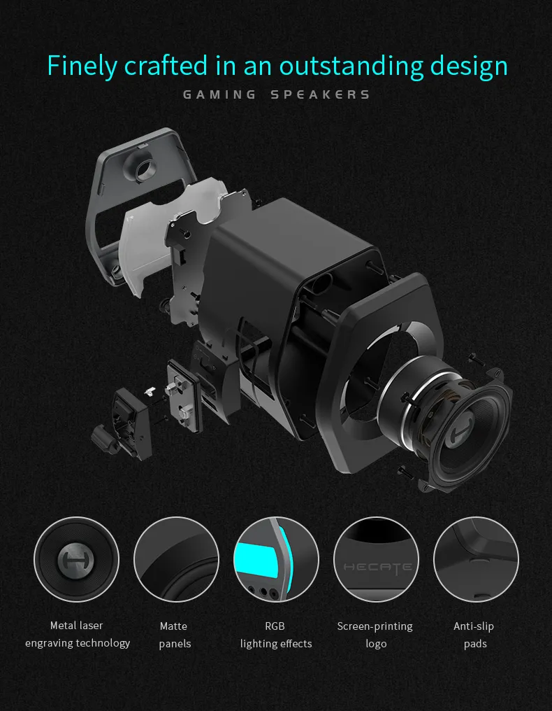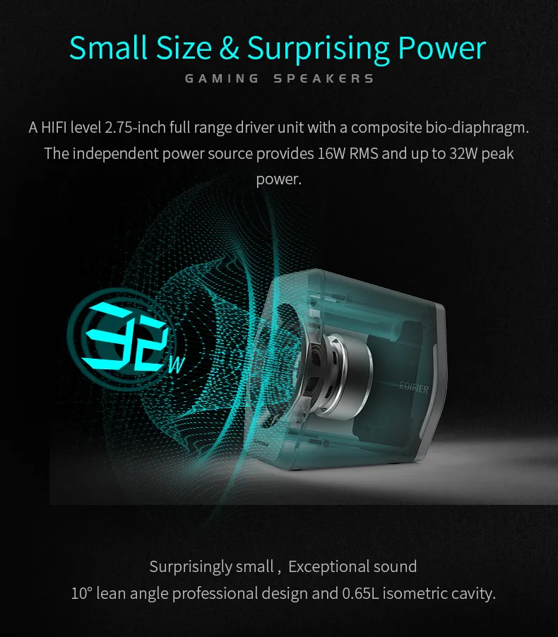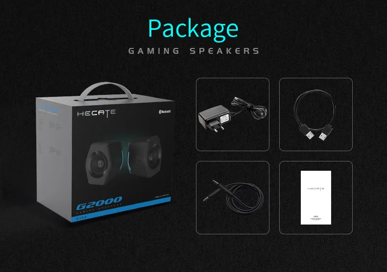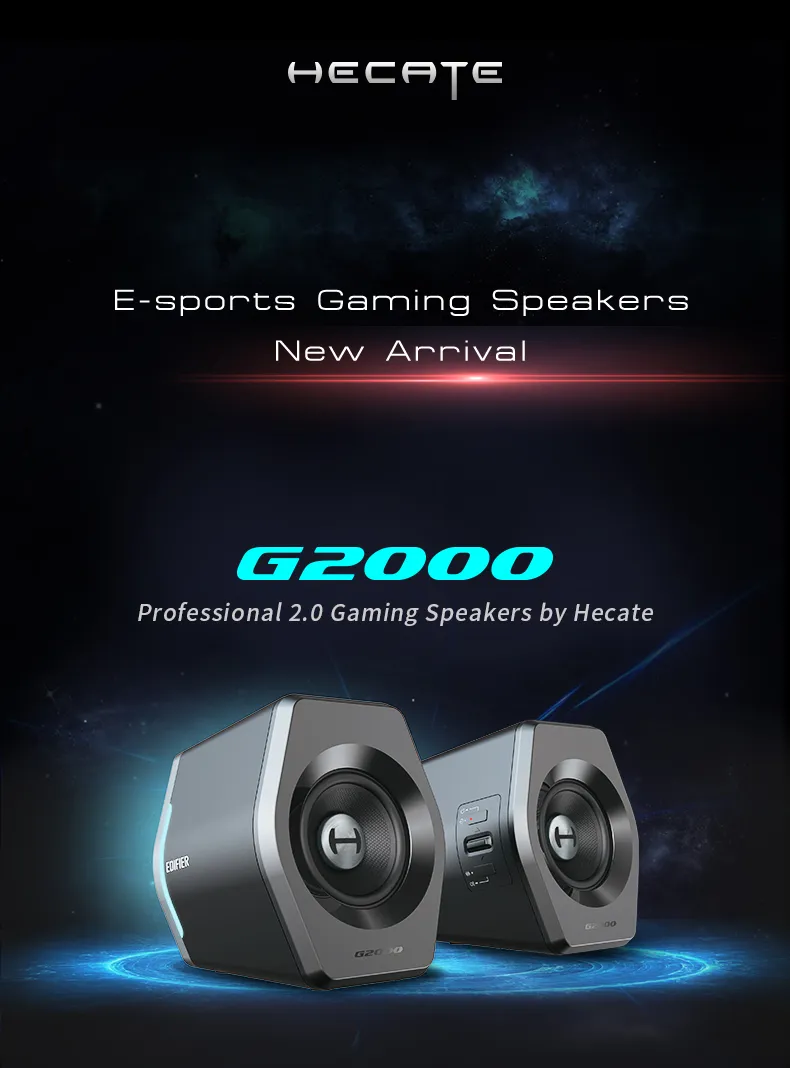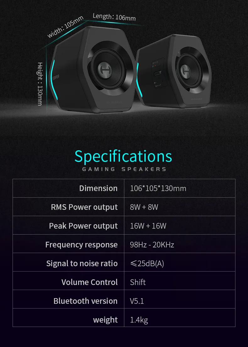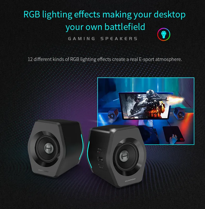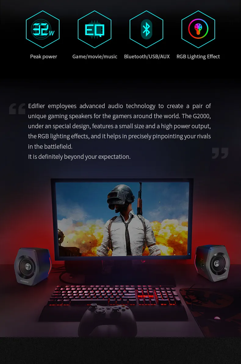 Edifier G2000 ลำโพงบลูทูธไร้สาย เชื่อมต่อผ่าน aux 3.5 มม. ใช้ไดรเวอร์แบบ Full Range ขนาด 2.75 นิ้ว มีกำลังขับ 16 วัตต์ ไฟ RGB อุปกรณ์ปรับแต่งเสียงสำหรับคอมพิวเตอร์