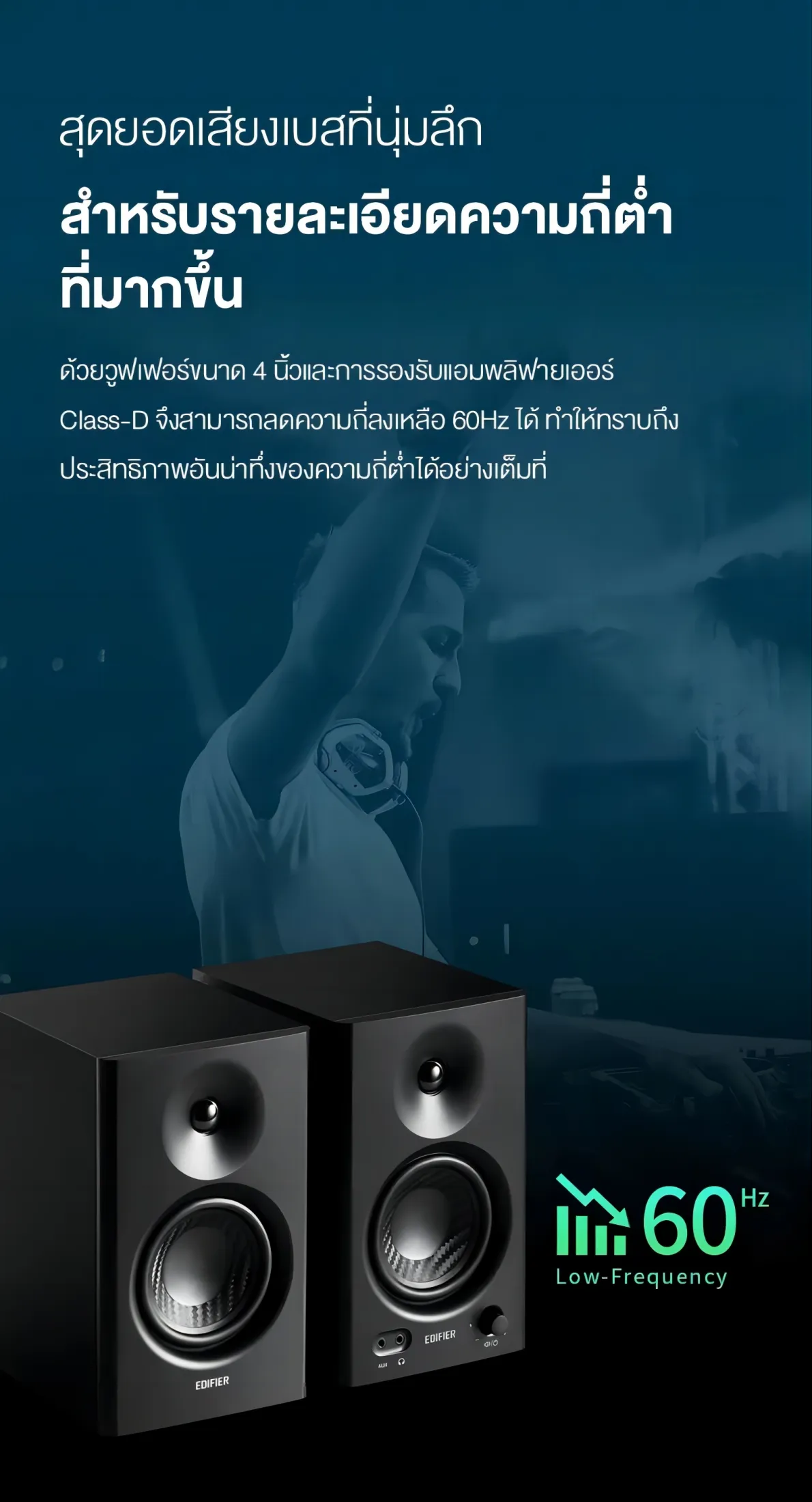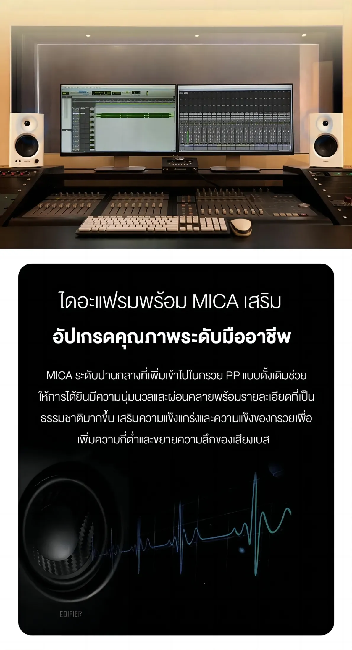 - คุณภาพเสียงระดับสตูดิโอ – ทวีตเตอร์ซิลค์โดมขนาด 1 นิ้ว และวูฟเฟอร์คอมโพสิตขนาด 4 นิ้ว ให้เสียงที่คมชัด นุ่มนวล และเสียงโดยรวม โครงสร้างไม้ MDF ช่วยลดเสียงสะท้อนและให้เสียงที่แท้จริง