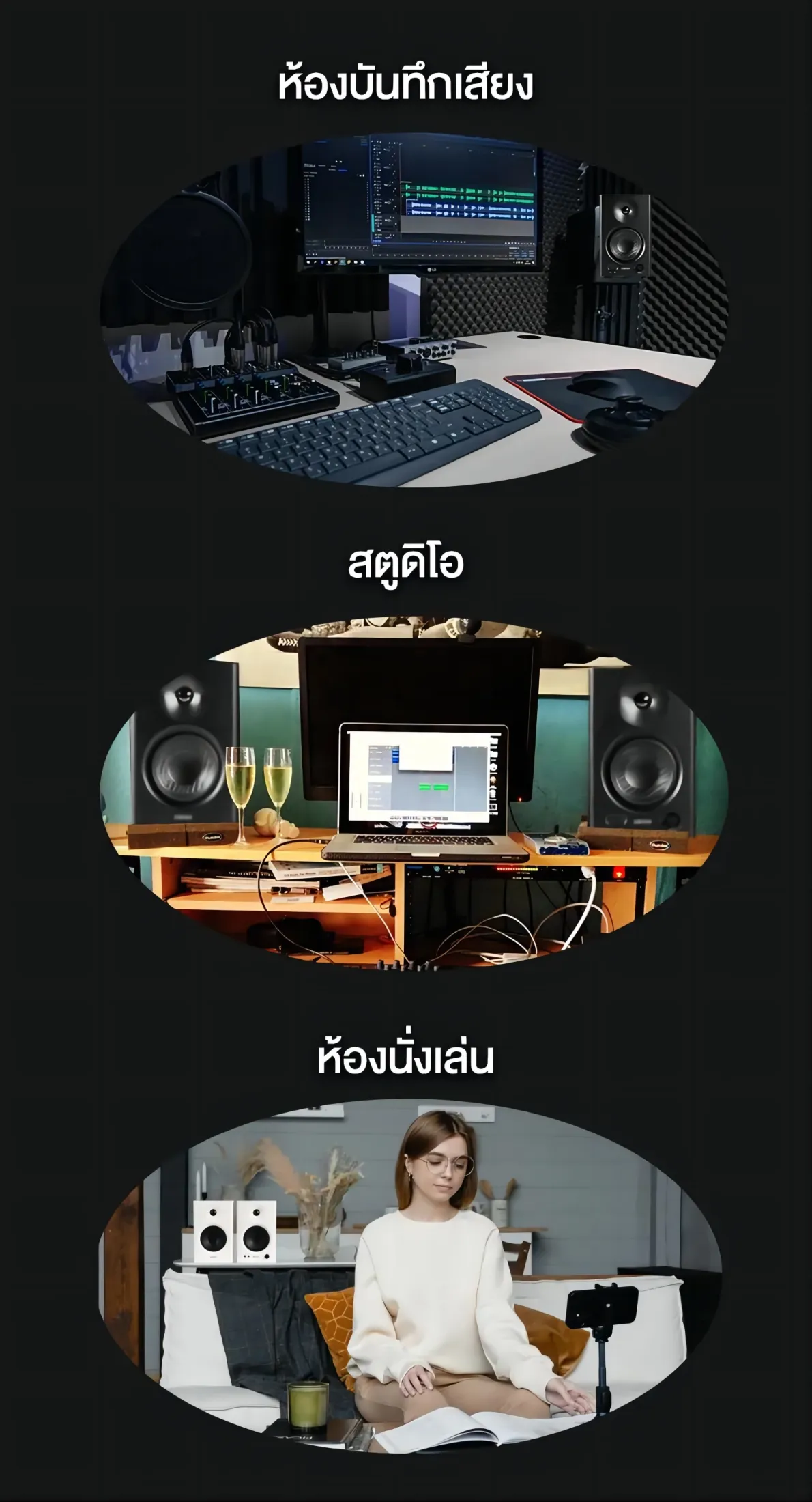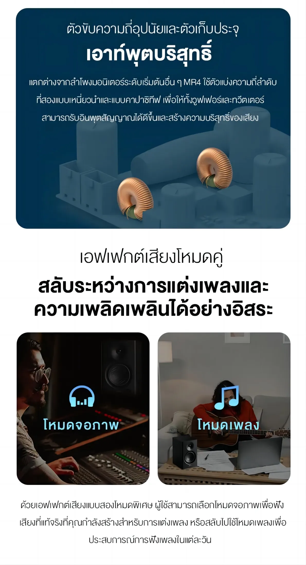 - การออกแบบโหมดคู่ที่รอบคอบ – สลับระหว่างโหมดจอภาพได้อย่างอิสระ – เพื่อฟังเสียงที่แท้จริงสำหรับการผลิตเพลงและโหมดเพลง – เพลิดเพลินกับเสียงเพลงได้ทุกวันเพื่อการผ่อนคลายตามความต้องการของคุณ