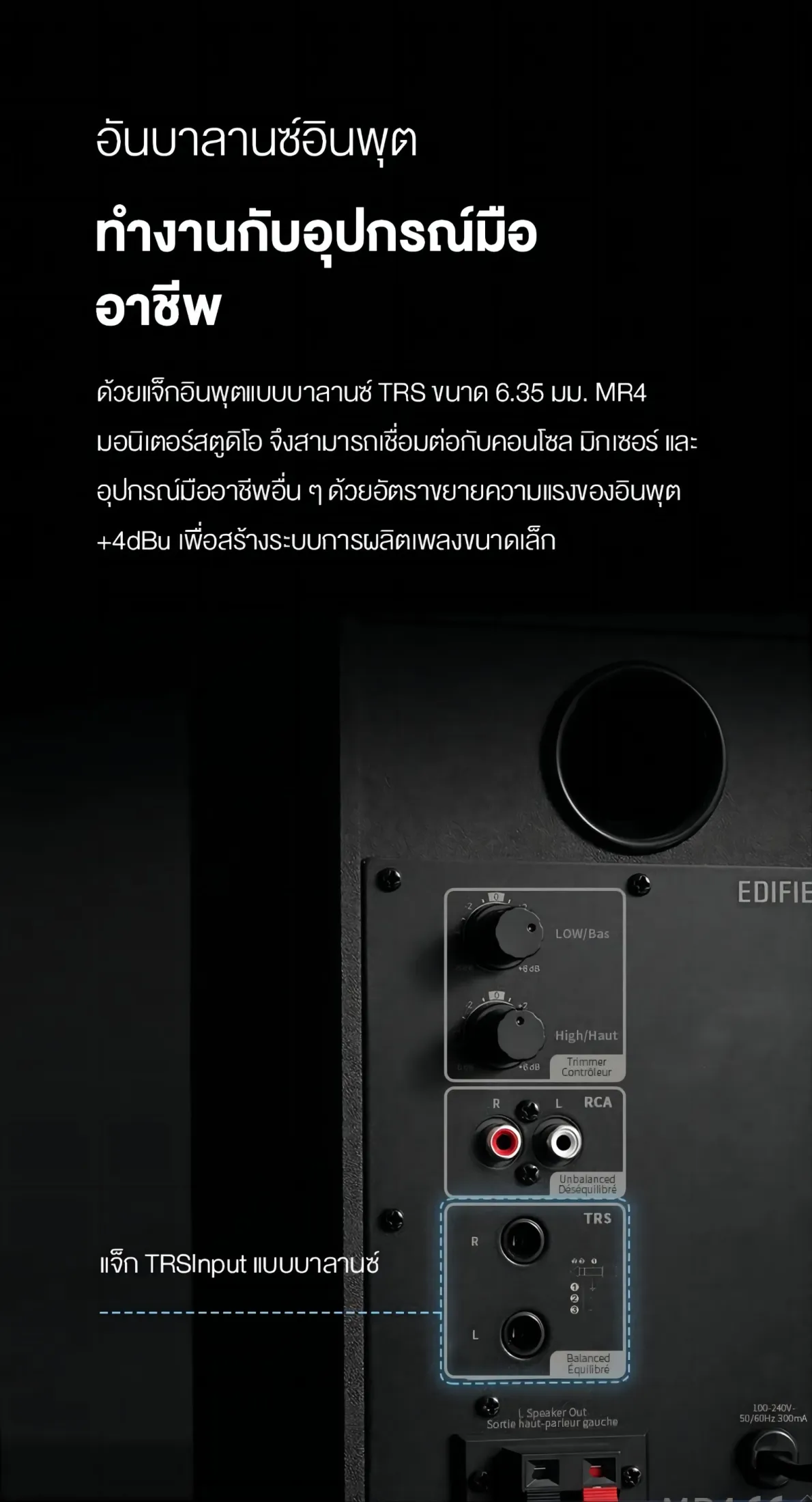 - การเชื่อมต่อที่ยืดหยุ่น – อินพุต TRS แบบบาลานซ์ขนาด 1/4 นิ้ว อินพุต RCA อันบาลานซ์ อินพุต AUX อันบาลานซ์ และเอาต์พุตหูฟังด้านหน้าได้รับการติดตั้งเพื่อเชื่อมต่อกับอุปกรณ์ต่าง ๆ เช่น มิกเซอร์ คอมพิวเตอร์ แท็บเล็ต เป็นต้น