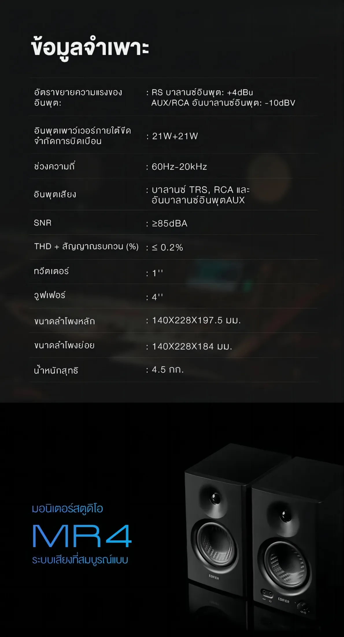 F1410 Edifier MR4 ลำโพงมอนิเตอร์สตูดิโอ เสียงสมจริง เสียงเบสที่นุ่มลึกด้วยวูฟเฟอร์ขนาด 4 นิ้ว อุปกรณ์ขยายเสียงแบบ Class-Dและเพลิดเพลินกับเสียงดนตรีแบบเอฟเฟกต์เสียงโหมดคู่