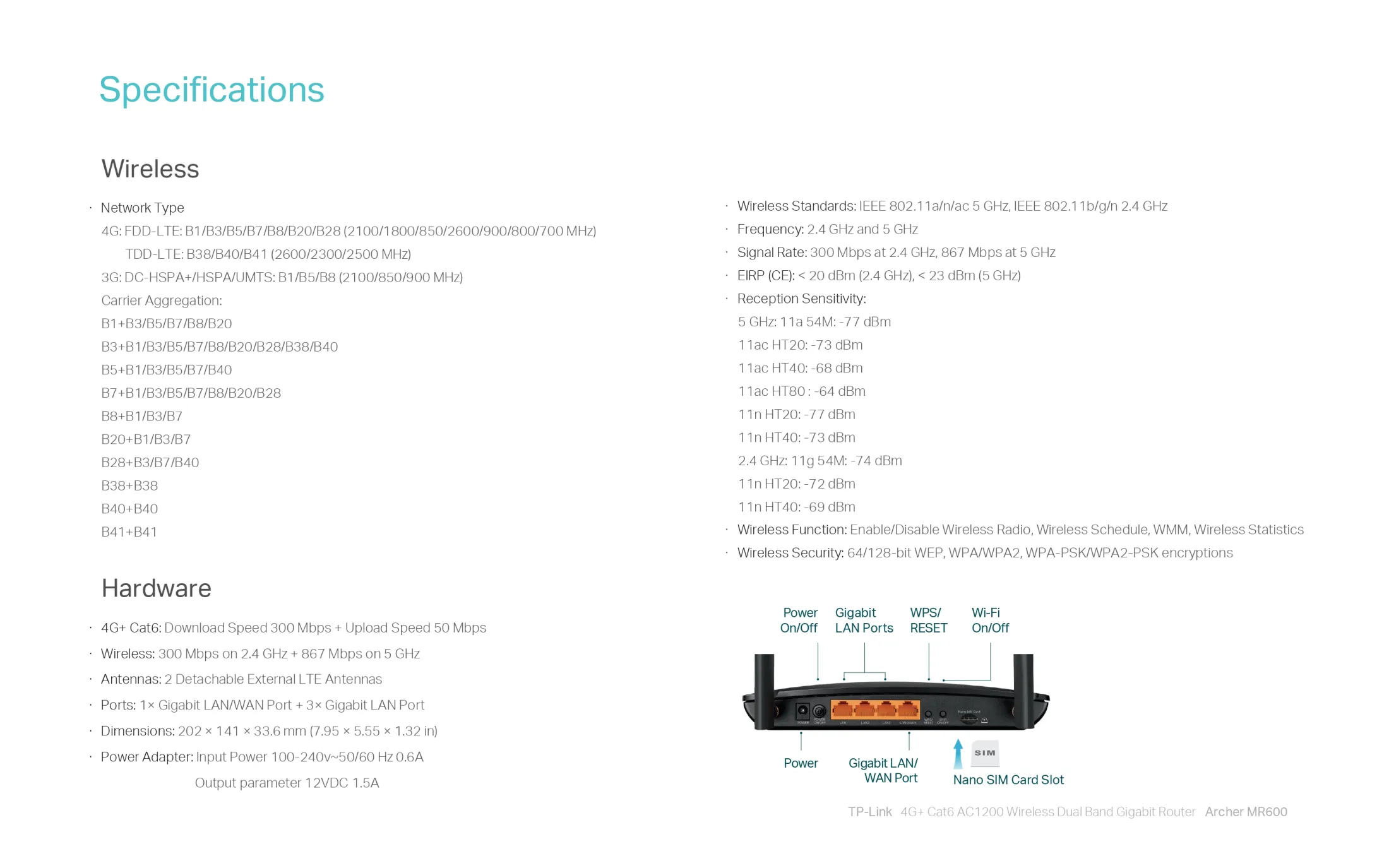 TP-Link Network Archer MR600 4G+Cat6 AC1200 Wireless Dual Band 4G LTE Router