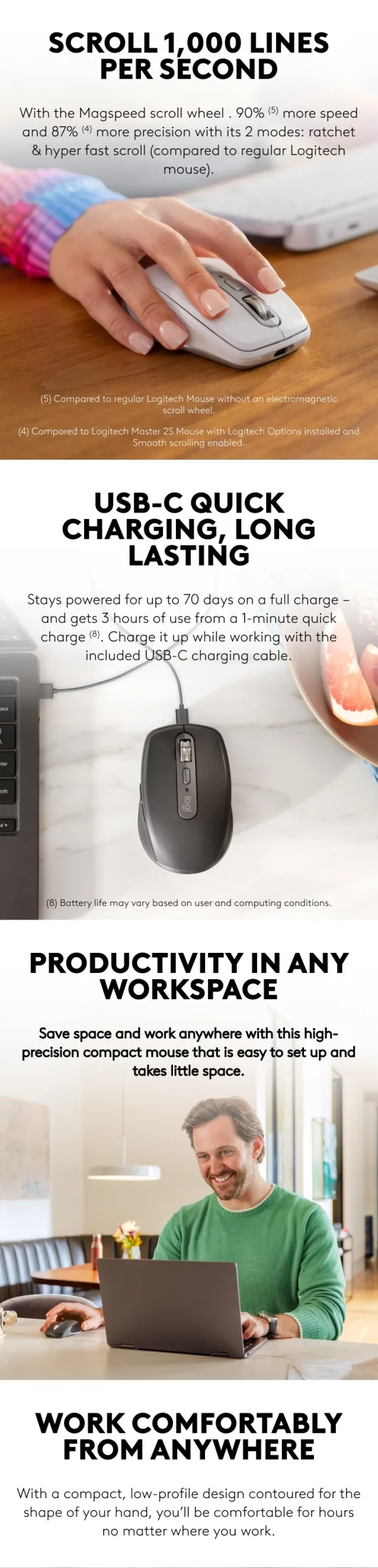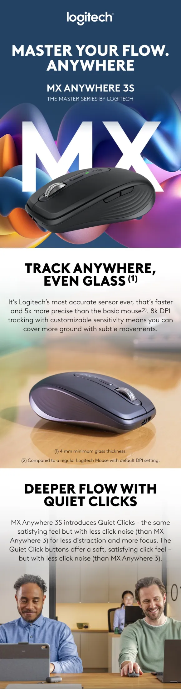 – คลิกที่เงียบ: ความรู้สึกที่น่าพอใจเหมือนเดิมแต่มีเสียงรบกวนจากการคลิกน้อยลง (กว่า MX Anywhere 3) เพื่อความวอกแวกน้อยลงและมีสมาธิมากขึ้น