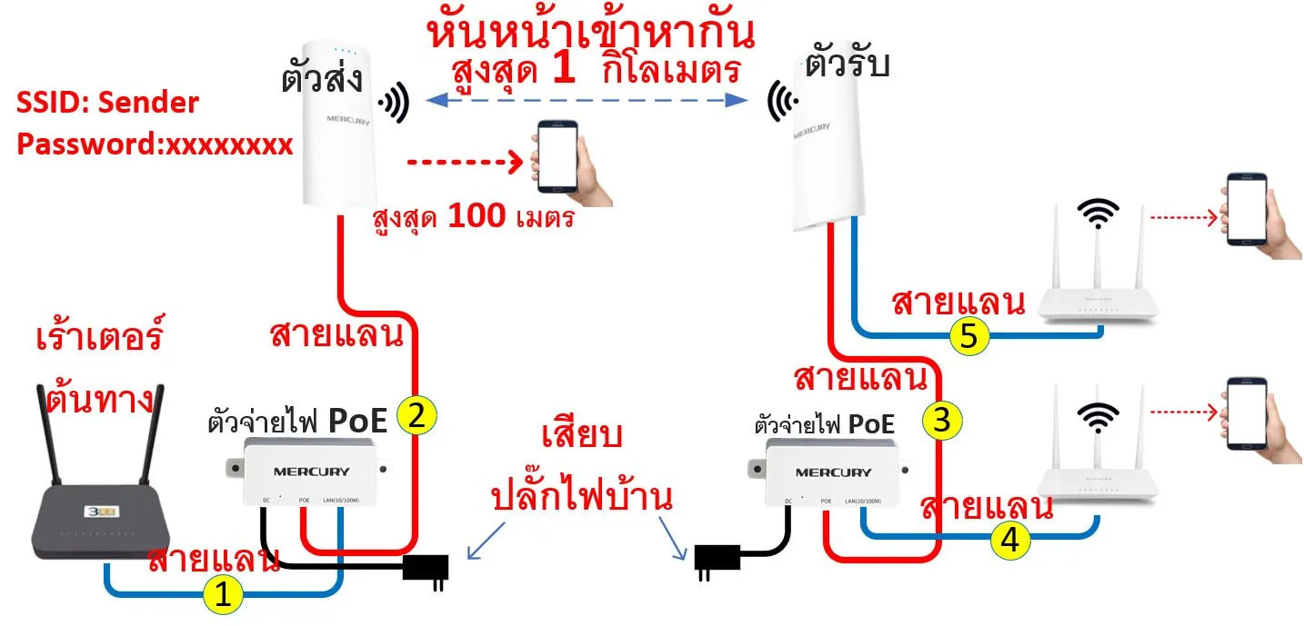 คือการเชื่อมต่อเครือข่ายระหว่าง 2 จุด ที่อยู่ห่างไกลกันให้อยู่ในเครือข่ายเดียวกัน …. ขออธิบายง่ายๆ ให้เห็นภาพครับ สมุมติว่า เรามีบ้าน 2 หลัง ที่อยู่ห่างกัน 700 เมตร… โดยมีบ้านหลังที่ 1 ที่ซึ่งติดตั้งอินเตอร์เน็ตบ้านอยู่แล้ว แต่ไวไฟ มันก็ครอบคลุมที่บ้านหลังแรกเท่านั้น …. เราก็ติดตั้งตัวส่งสัญญาณไวไฟ แล้วเสียบสายแลนจากเร้าเตอร์ต้นทาง เข้าไป ส่วนบ้านหลังที่ 2 เราก็ติดตั้ง ตัวรับ แล้ว เสียบสายแลนจากตัวรับไปยัง เร้าเตอร์ที่ติดตั้งในบ้านหลังที่ 2 เท่านี้ บ้านหลังที่ 2 ก็จะสามารถใช้งานอินเตอร์เน็ตผ่านไวไฟ ได้ …ดูภาพประกอบด้านล่างนะครับ