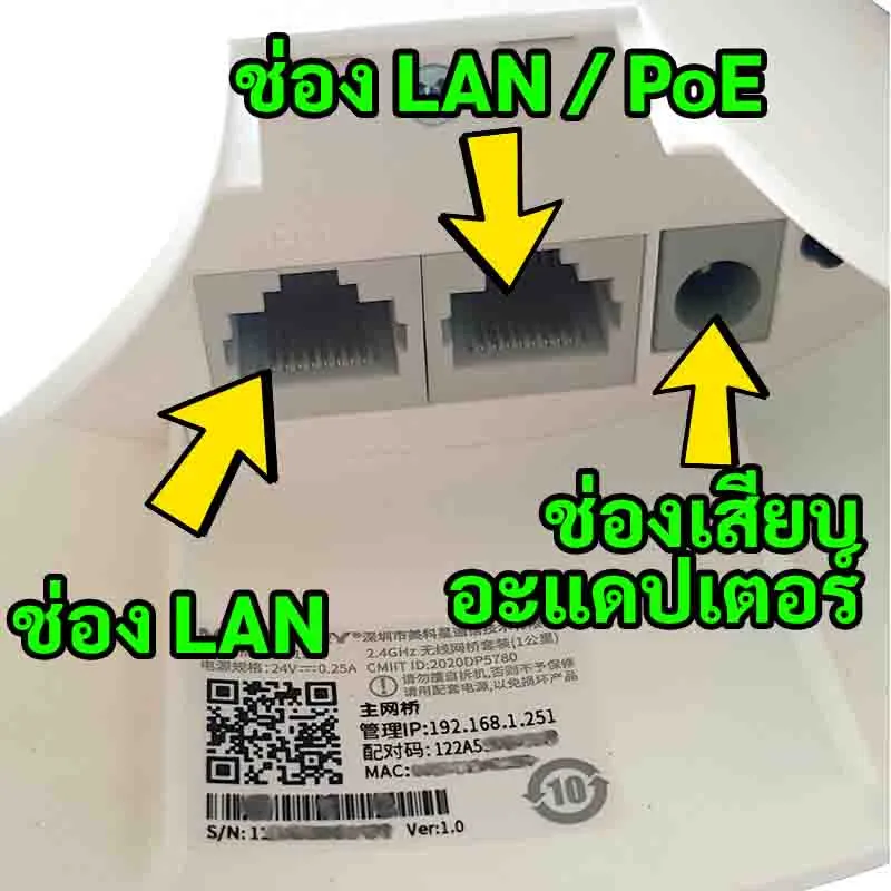 4) สายแลนเส้นที่ 4 เสียบสายแลนจาก รู LAN(10/100M)ของตัวจ่ายไฟ PoE ไปยังไวไฟ แอสเสสพ๊อยท์ (Access Point)