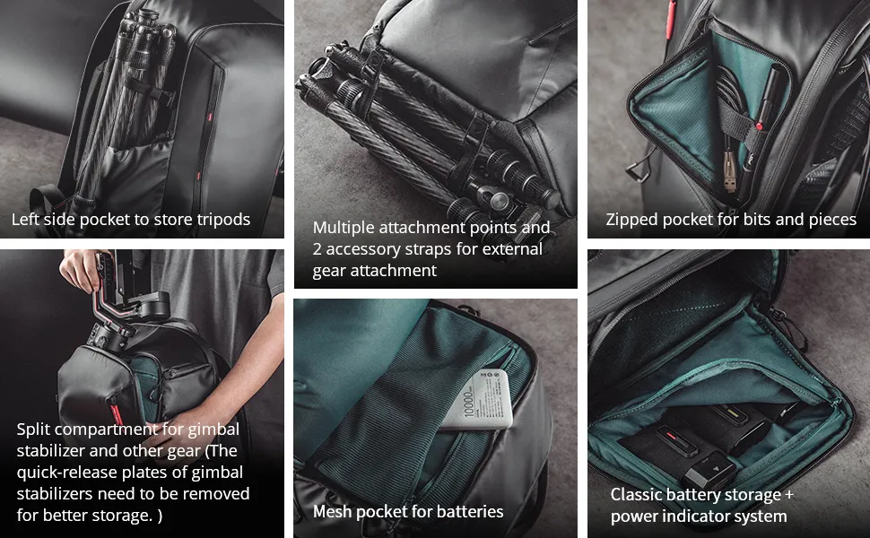 เข้าได้สองทางเร็วกว่ากระเป๋าเป้สะพายหลังปกติพร้อมกระเป๋าติดแท็กแบบซ่อนหัวเข็มขัดแม่เหล็กล็อคเพื่อปกป้องอุปกรณ์ของคุณอย่างปลอดภัยสายรัดสำหรับแล็ปท็อปและแท็บเล็ตสายรัดอุปกรณ์เสริมและห่วงที่สร้างขึ้นด้านล่างช่วยให้คุณสามารถพกของพิเศษเช่นขาตั้งกล้องได้กระเป๋าแบตเตอรี่มาพร้อมกับตัวบ่งชี้พลังงานแบตเตอรี่แม่เหล็กอเนกประสงค์เพิ่มเป็นสองเท่าเป็น1/4″ ประแจเกลียวปล่อยอย่างรวดเร็ว