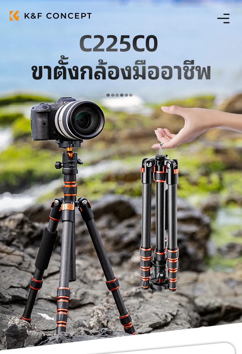 F1463 K&F Concept Camera Carbon Fiber Tripod Lightweight Travel 60″ 1.5m 17.6lbs Load 360° Ball Head (C225C0+BH-25) ขาตั้งกล้อ KF09.077V3