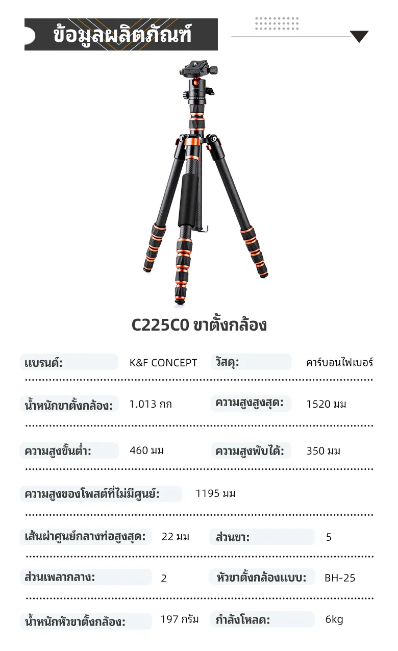 - 【 Lightweight & Portable 】 K&F Concept C225C0 + BH-25 (รุ่นเก่า BA225) ท่อขาตั้งกล้องคาร์บอนไฟเบอร์ทำจากคาร์บอนไฟเบอร์คุณภาพมีน้ำหนักเพียง 2.20 ปอนด์มีความยาว 14 นิ้วเมื่อพับน้ำหนักเบาเป็นพิเศษและกะทัดรัดพร้อมความสามารถในการรับน้ำหนัก หนักถึง 17.63lbs / 8kg จึงเหมาะสำหรับการถ่ายภาพในร่มและกลางแจ้ง