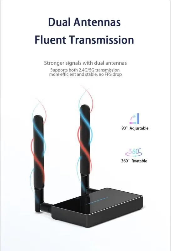 5.การออกแบบที่ทันสมัย: กรอบอะลูมินัมอัลลอยและฝาครอบแก้วอะคริลิบวกกับเอฟเฟกต์แสงทำให้ดูทันสมัยและดูน่าสนใจการออกแบบเครื่องส่งสัญญาณขนาดกะทัดรัดเหมาะสำหรับแล็ปท็อปการออกแบบเสาอากาศคู่ประสิทธิภาพการส่งข้อมูล5G เร็วและอีกมากมายเสถียร คุณสมบัติ -สี: ดำ -ขนาด: เครื่องรับสัญญาณ: 120*65*18มม. เครื่องส่งสัญญาณ: 60*60*13.5มม.