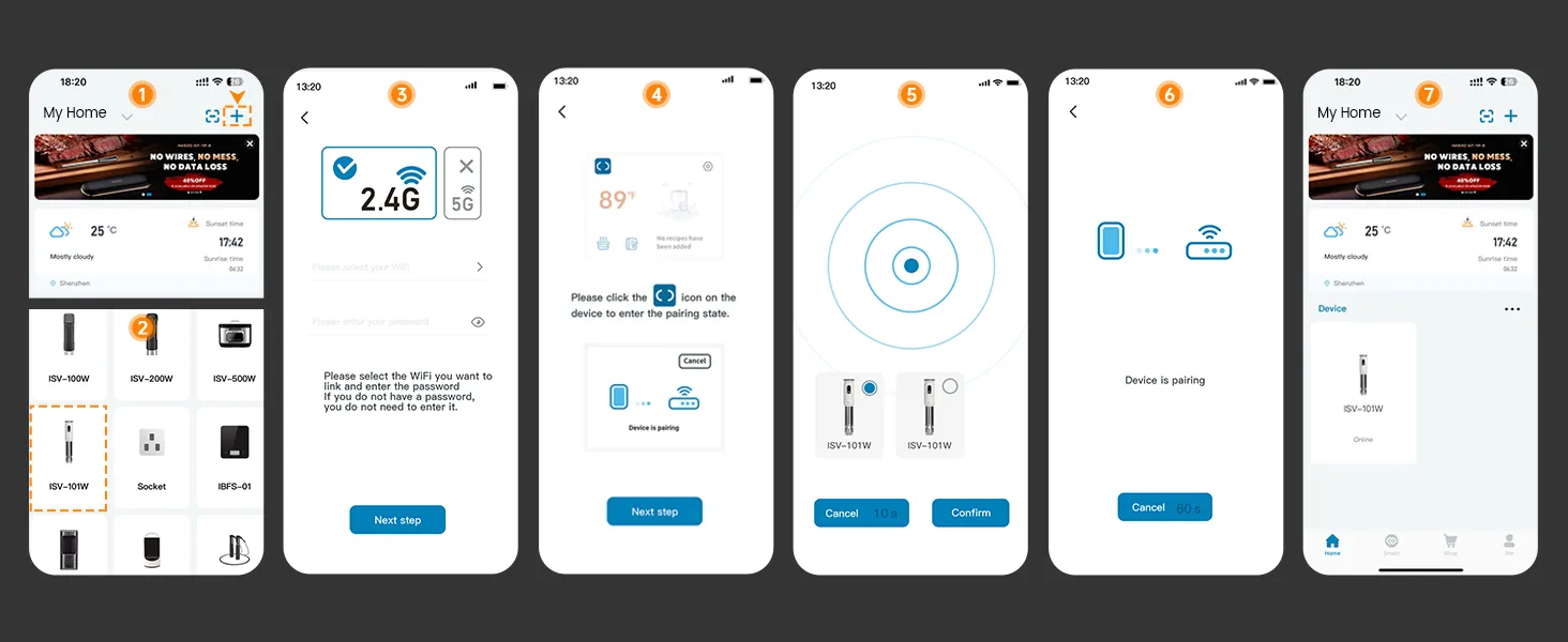 - 📶การตรวจสอบ WiFi📶: ใช้ความเร็ว2.4GHz เชื่อมต่อไวไฟเครื่องโซส์ไวด์ใน ISV-101W คุณสามารถสร้างและควบคุมกระบวนการทำอาหารแบบค่อยเป็นค่อยไปได้ทุกจุดและสถานที่โดยใช้แอป inkbird แอพพลิเคชั่นอัจฉริยะประกอบด้วยเมนูเนื้อสัตว์ที่ได้รับการรับรองจาก USDA พร้อมตัวเลือกสำหรับอุณหภูมิในการปรุงอาหารและความชอบตามต้องการเพื่อลดขั้นตอนการทำอาหารสำหรับมือใหม่ ตัวเลือกการทำอาหารของคุณสามารถซิงโครไนซ์ระหว่างแอพและ ISV-101W