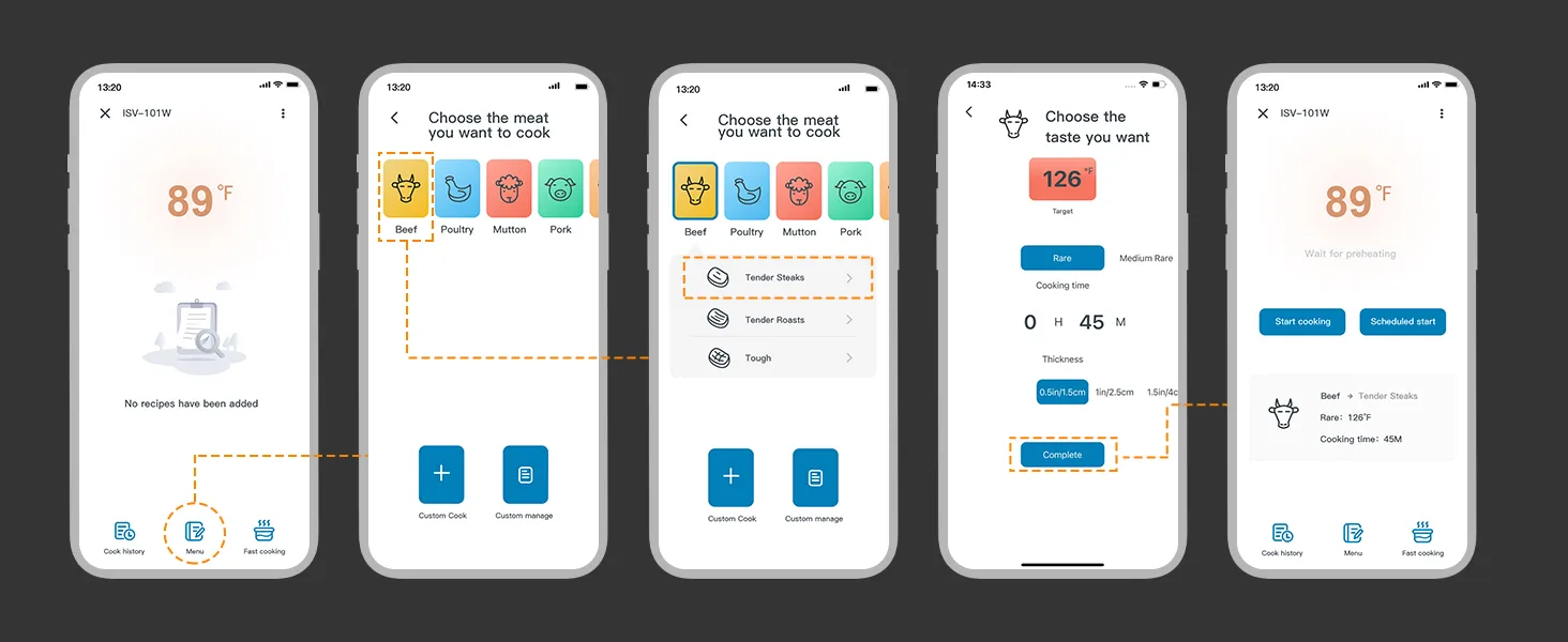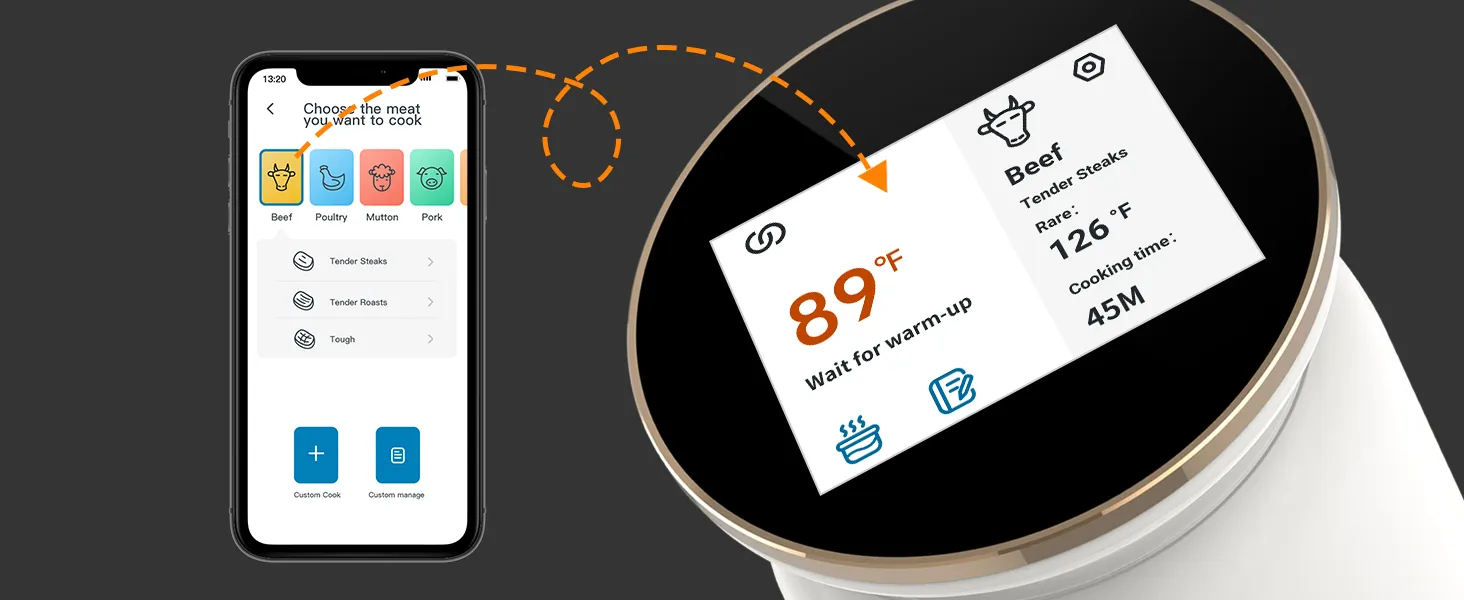 การปรุงอาหารเสร็จสิ้นและอีกมากมาย Pre-ปลุก:รองรับฟังก์ชันการเตือนการปรุงอาหารล่วงหน้าเพื่อให้คุณสามารถสามารถใช้เนื้อออกได้ทันเวลาเพื่อหลีกเลี่ยงการสุกเกินไปเนื่องจากความร้อนที่เหลืออยู่ในน้ำ สำหรับผลลัพธ์การปรุงอาหารที่สมบูรณ์แบบคุณยังสามารถตั้งค่าสัญญาณเตือนอุณหภูมิเป้าหมายนาฬิกาจับเวลาทำอาหารและสัญญาณเตือนการทำอาหารเสร็จสมบูรณ์เพื่อให้เครื่องส่งเสียงเตือนและแอพจะส่งการแจ้งเตือนไปเพื่อเตือนคุณเมื่ออาหารพร้อม