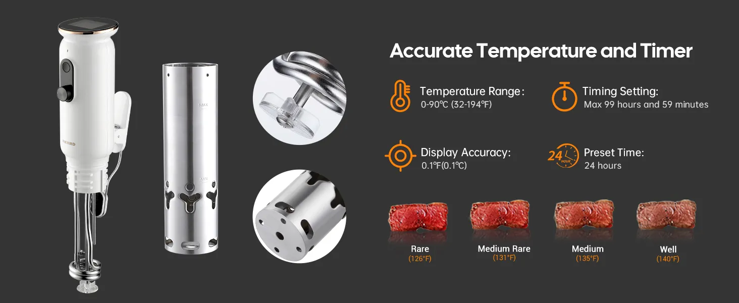 0.1 ℃/0.3 ℉ อุณหภูมิที่แม่นยำ ควบคุม:ด้วยความแม่นยำในการวัด0.1 ℃/0.3 ℉ และฟังก์ชันการสอบเทียบ ISV-101W สามารถควบคุมอุณหภูมิได้แม่นยำกว่าคู่แข่งส่วนใหญ่ในตลาดและมีช่วงการควบคุมอุณหภูมิที่กว้าง0-90 °C/32-194 °F ตอบสนองทุกความต้องการในการทำอาหารทุกวัน ด้วยเทคโนโลยีการทำความร้อนระบบทางเดินน้ำ3มิติที่ทันสมัยของมันสามารถให้ความคงที่และให้ความร้อนกับเนื้อสัตว์ได้อย่างง่ายดายคงความชุ่มชื้นและรสชาติดั้งเดิมของเนื้อสัมผัสในฝันและรสชาติของคุณ